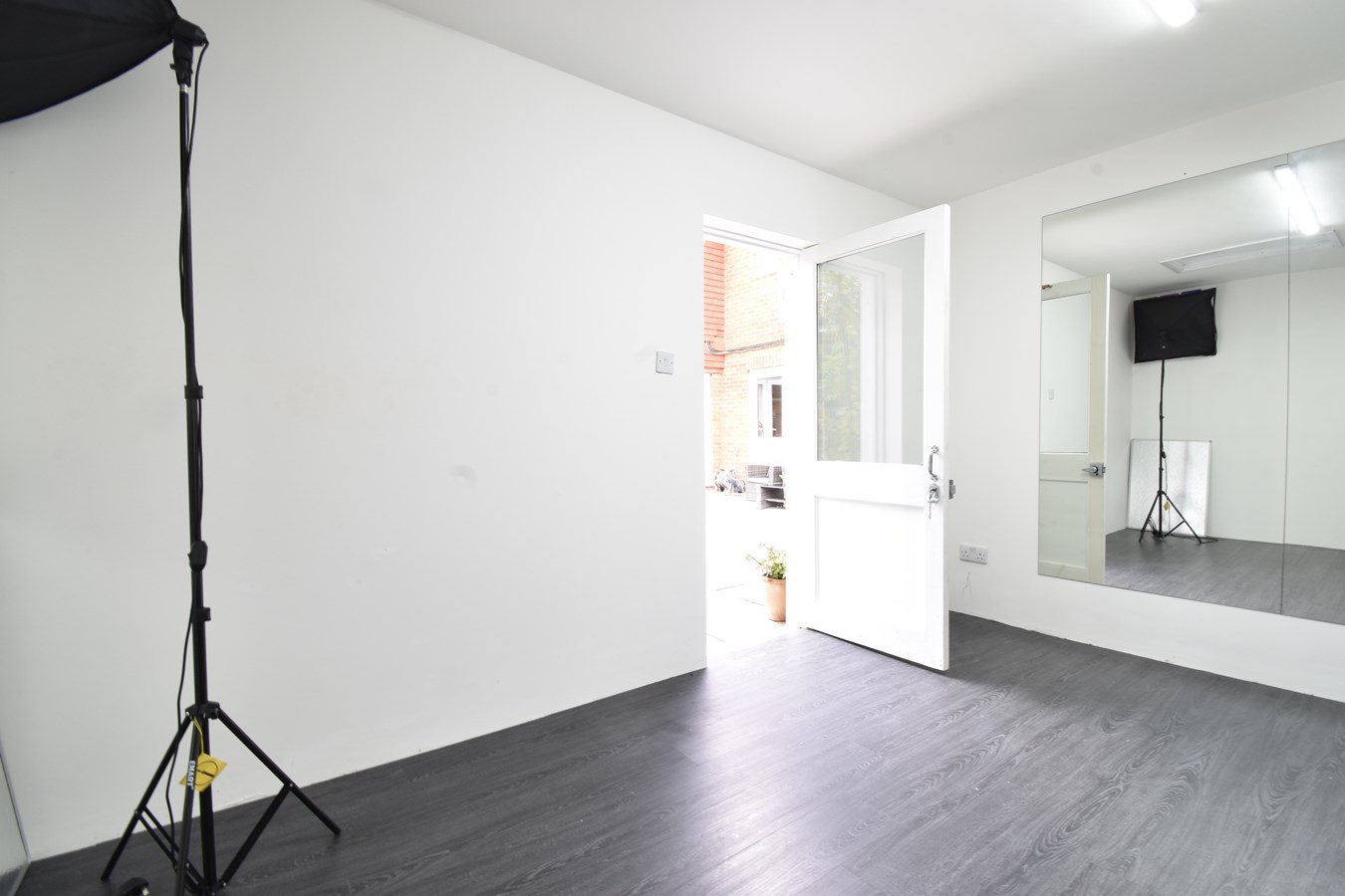Split for storage at front. Home office/studio with power. Laminate flooring. Mirrored wall.