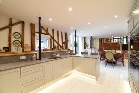 32' 9" x 17' 11" (9.98m x 5.46m) Double glazed window to front. Double glazed window to side. Double glazed window to rear. Double glazed door to rear access. Exposed beams. Storage cupboard. Range of base and wall units. Stone worktop. Raised wooden shelving. Double sink. Electric induction hob with extractor over. Integrated Smeg appliances to include dishwasher. Large fridge and separate large freezer. Double oven and separate microwave oven/grill combo. Coffee maker. TV point. Wall mounted thermostat. Underfloor central heating.