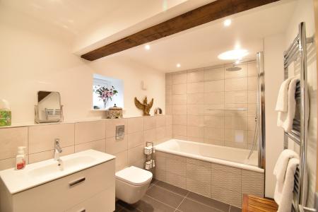 Double glazed frosted window to side. Suite comprising of concealed low level WC, vanity wall hung hand basin and bath with double shower attachment and glass screen. Exposed beams. Chrome heated towel rail. Localised tiling. Extractor.
