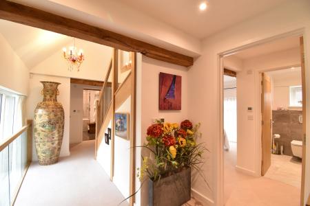 On the first floor there is a master bedroom with ensuite, a further bedroom and family bathroom whilst to the second floor there are two further double bedrooms. There is a feature glass corridor connecting to the second barn which offers a very versatile bedroom/living space/annexe or office, separate bathroom and WC.