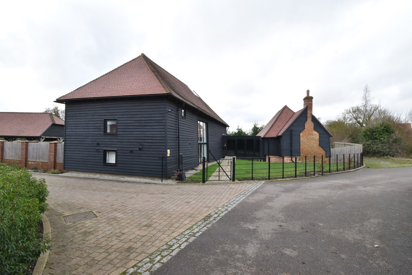 Double car barn with covered parking area for two further vehicles.