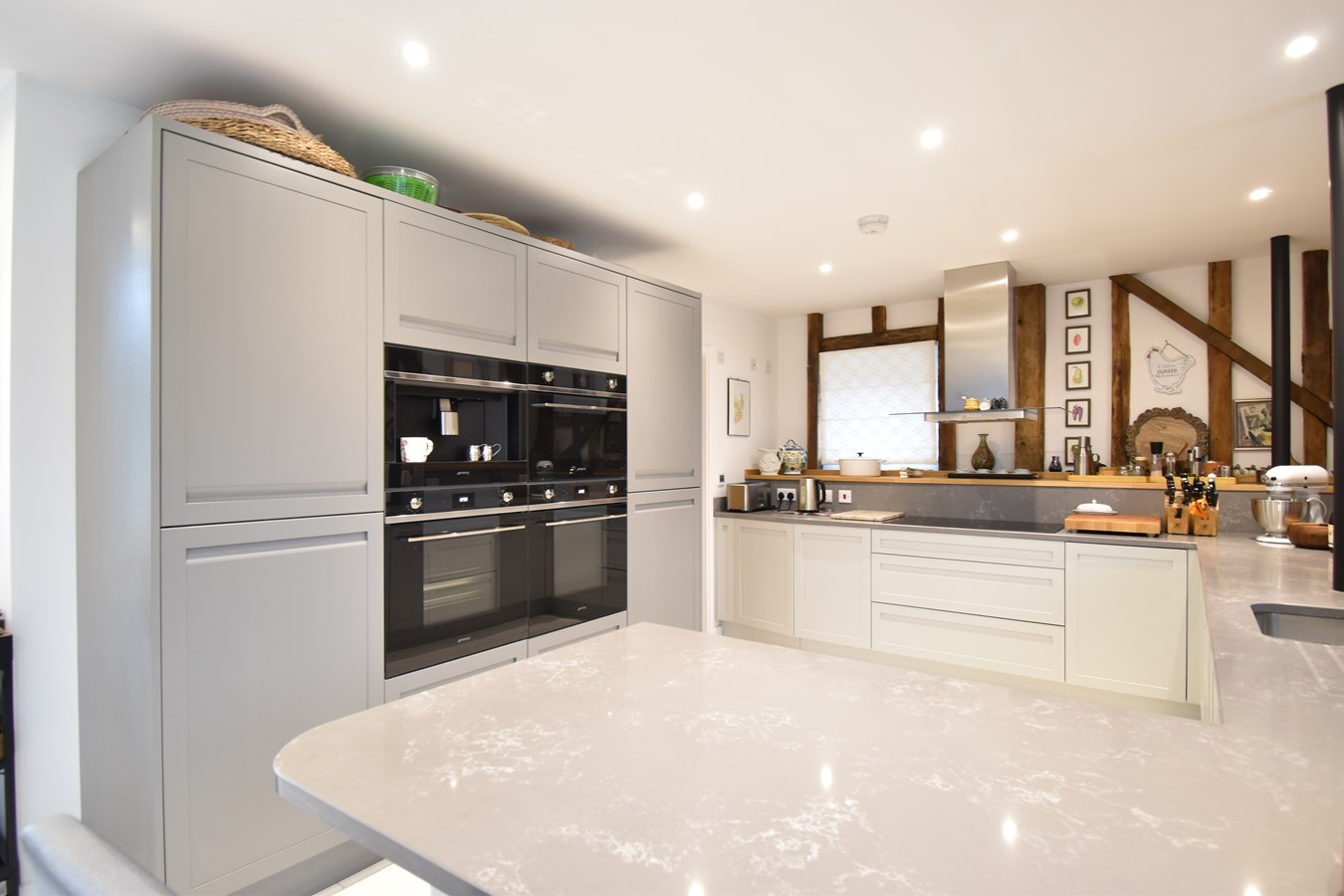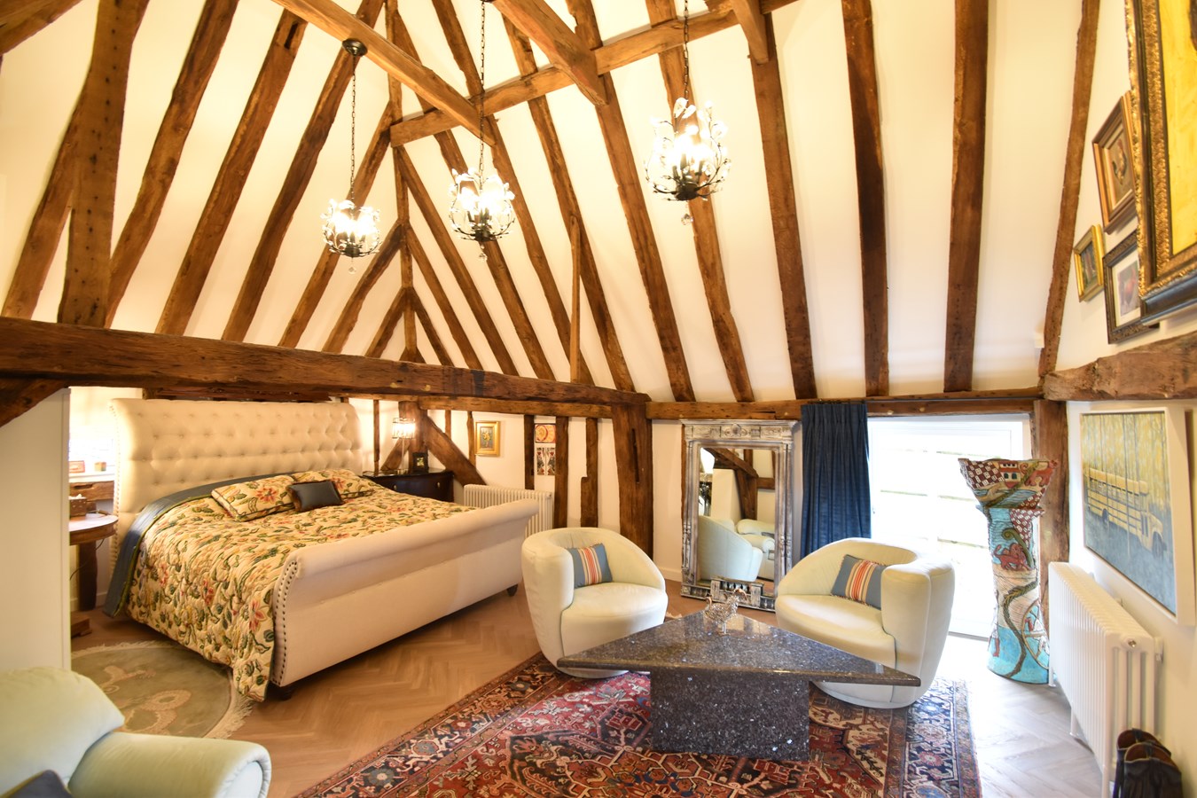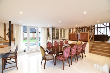 The dwelling is uniquely arranged across two barns, showcasing breathtaking character features throughout.
