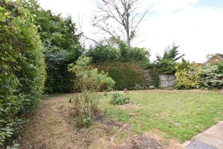 The garden measures approximately 45ft max in length by 40ft. Laid to lawn. Hedging. Open metal shed area.