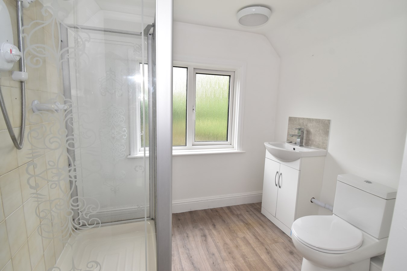 Double glazed frosted window to rear. White suite of low level WC, vanity hand basin and large full tiled shower cubicle. Radiator. Access to loft. Double cupboard.
