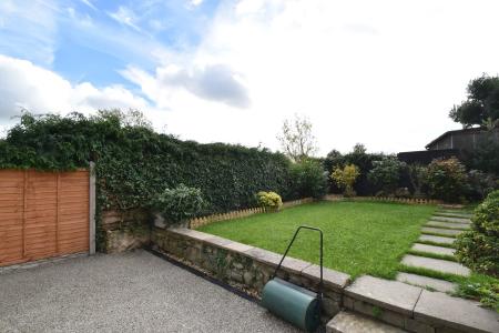 Raised lawn garden with shrubs and trees to borders. Hard standing area for shed. Shingled entertaining area. Outside light. Pedestrian side access.