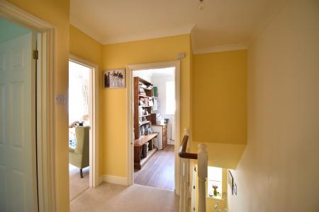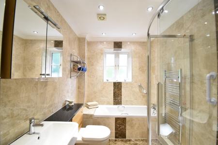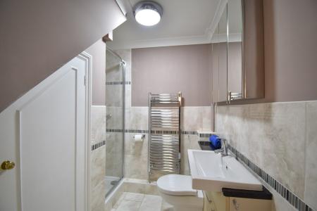 Double glazed obscured window to rear. Suite comprising of low level WC, wash hand basin with cupboard under, bath with shower attachment and separate shower cubicle with retractable glass screen Mirrored cabinets with built in radio. Fully tiled walls. Chrome heated towel rail. Extractor.