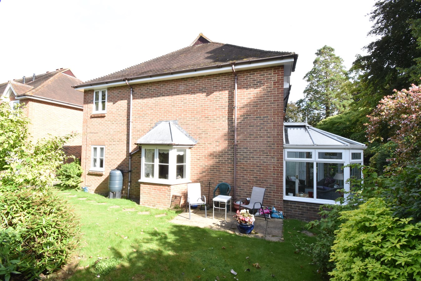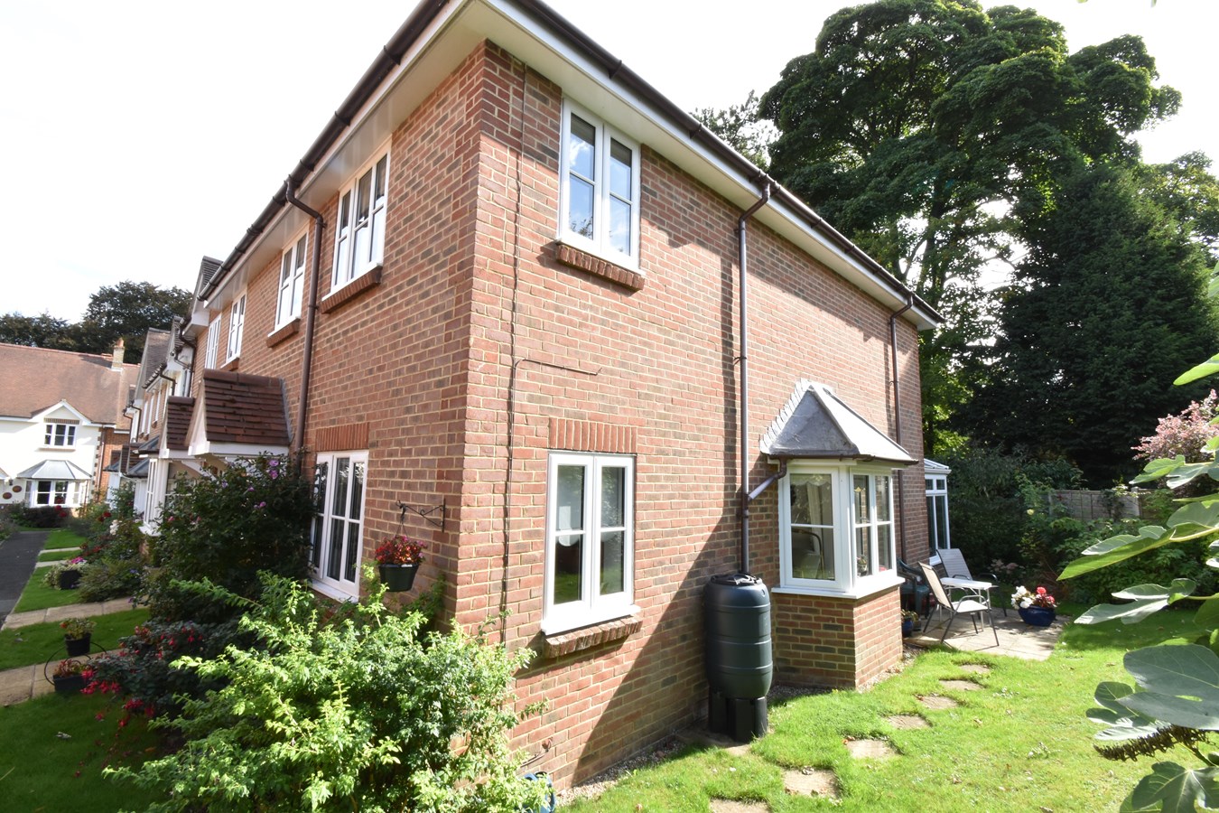 All gardens are mainly laid to lawn with mature plants and shrubs to border with mature trees at various locations. Communal patio area next to the fish pond.