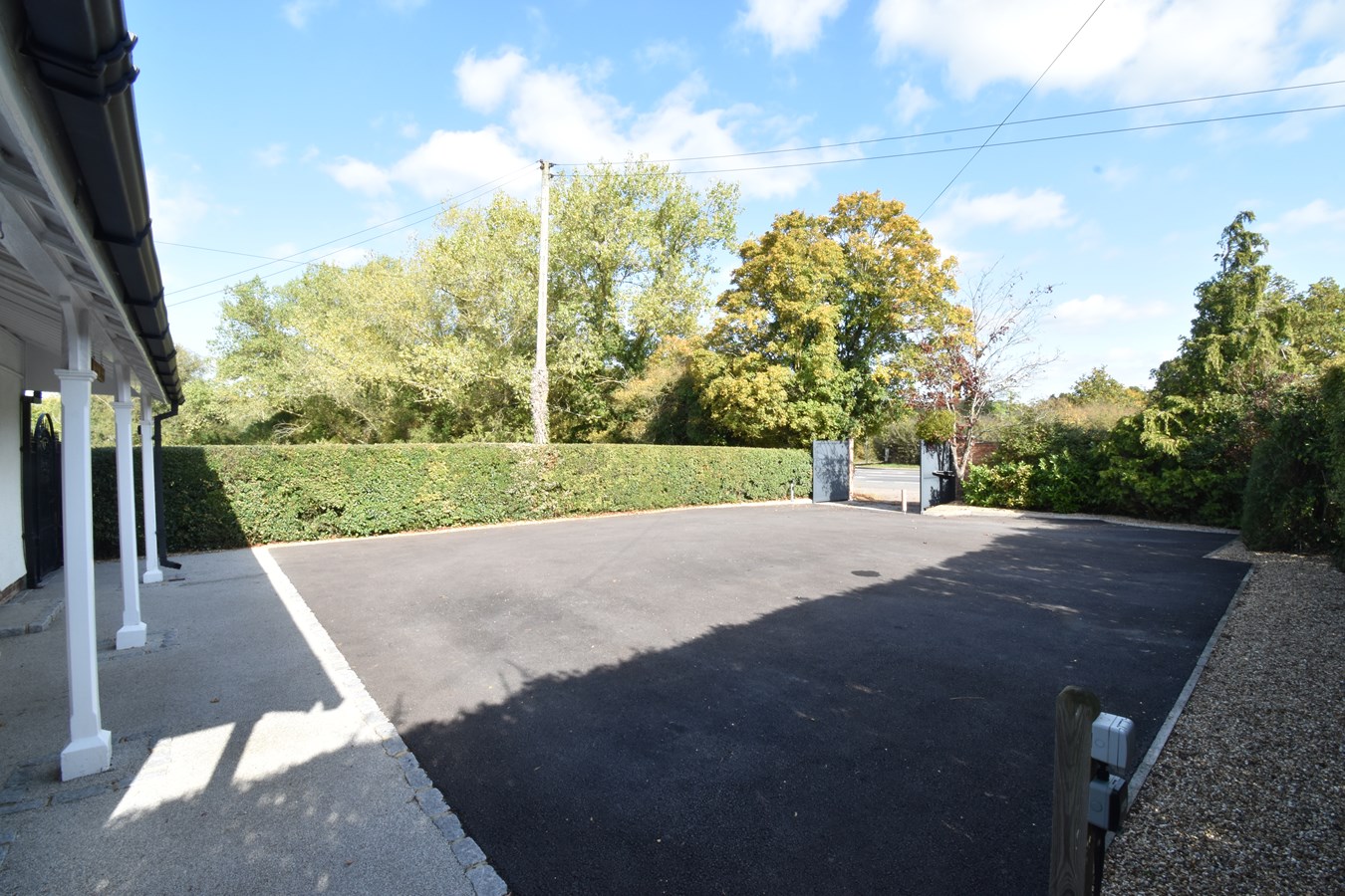 Electric gated entrance. Pedestrian gated side access. Hedge side borders with shingled area. Outside Security outside lights.