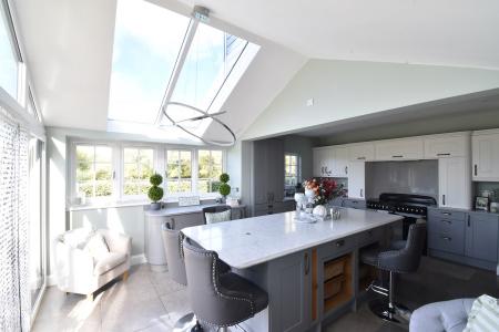 20' 1" x 14' 6" (6.12m x 4.42m) Two double glazed windows to side. Double glazed windows and sliding doors to rear. Velux windows. Extensive range of base and wall units. Stonework tops. Butler style sink. Integrated washing machine and tumble dryer. Space for electric AGA style oven with AEG extractor above. Space for American style fridge/freezer/ Large central island and breakfast bar with marble worktop and cupboards. Integrated wine chiller and dishwasher. TV point. Underfloor heating.