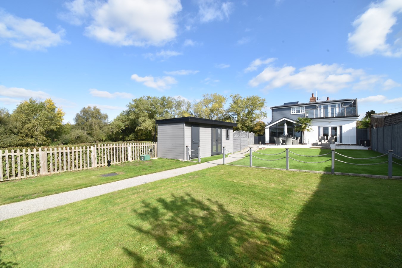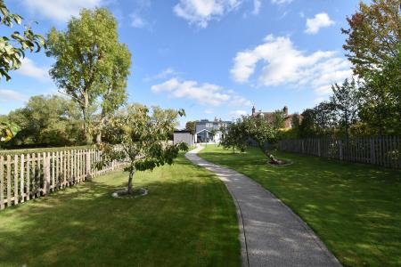 Large rear garden. Extensive entertaining area with pathway that extends the length of the garden. Fruit trees. Lawned area. Separate artificial lawned area. Outside lighting. Home bar and large cupboard. Large workshop with power and light. Paved pathway and shingled area. Pedestrian side access. Outside tap. Oil tank.