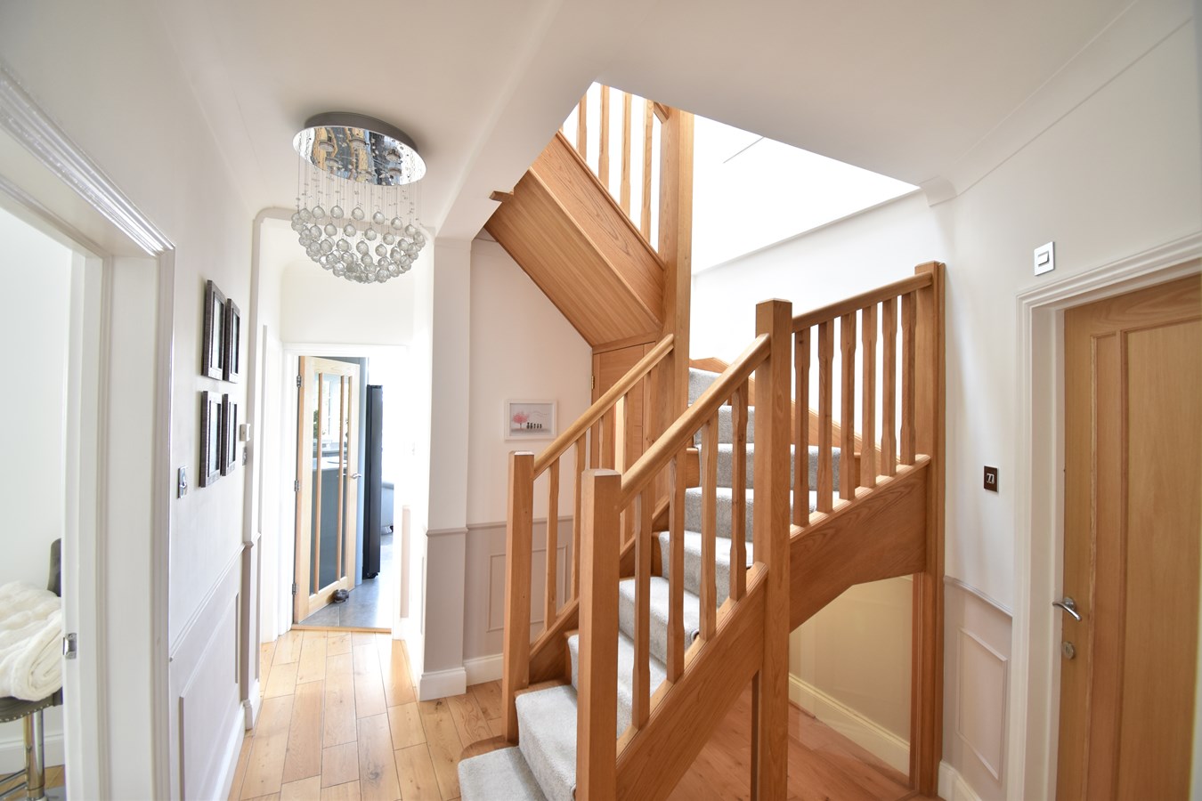 Cupboard housing consumer unit. Radiator. Stairs to first floor landing. Two further cupboards. Radiator. Panelled walls. CCTV system.