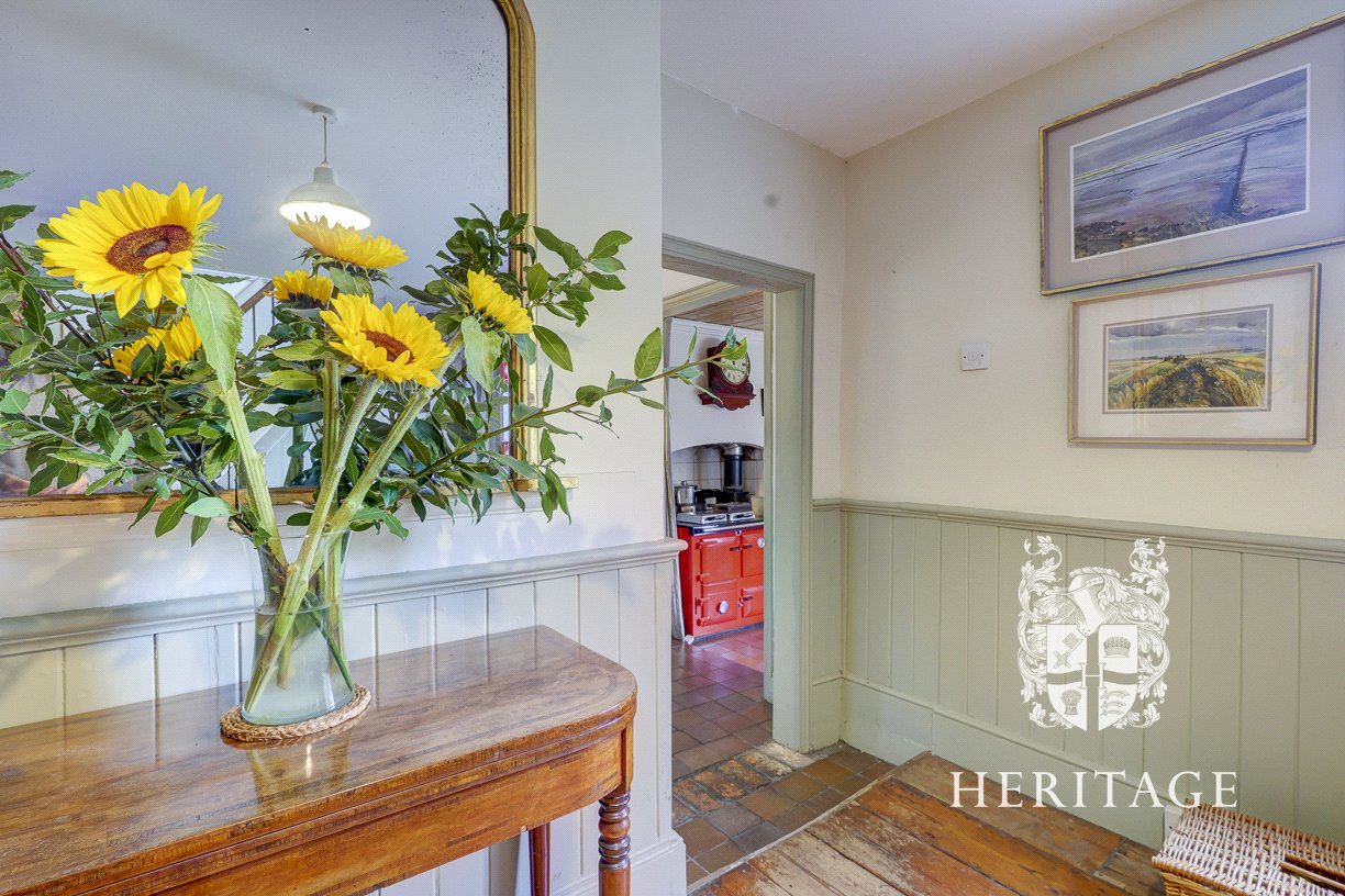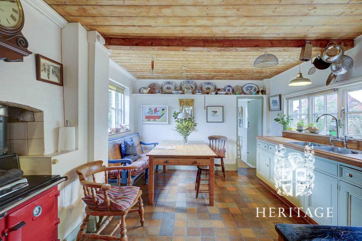 The home is entered via a vestibule and lobby, where a convenient ground-floor shower room can be found. Beyond lies a generous kitchen, fitted with bespoke cabinetry, solid wood worktops, and an oil-fired Aga. With ample space for a breakfast table, it is perfectly suited for both informal meals and everyday family living.