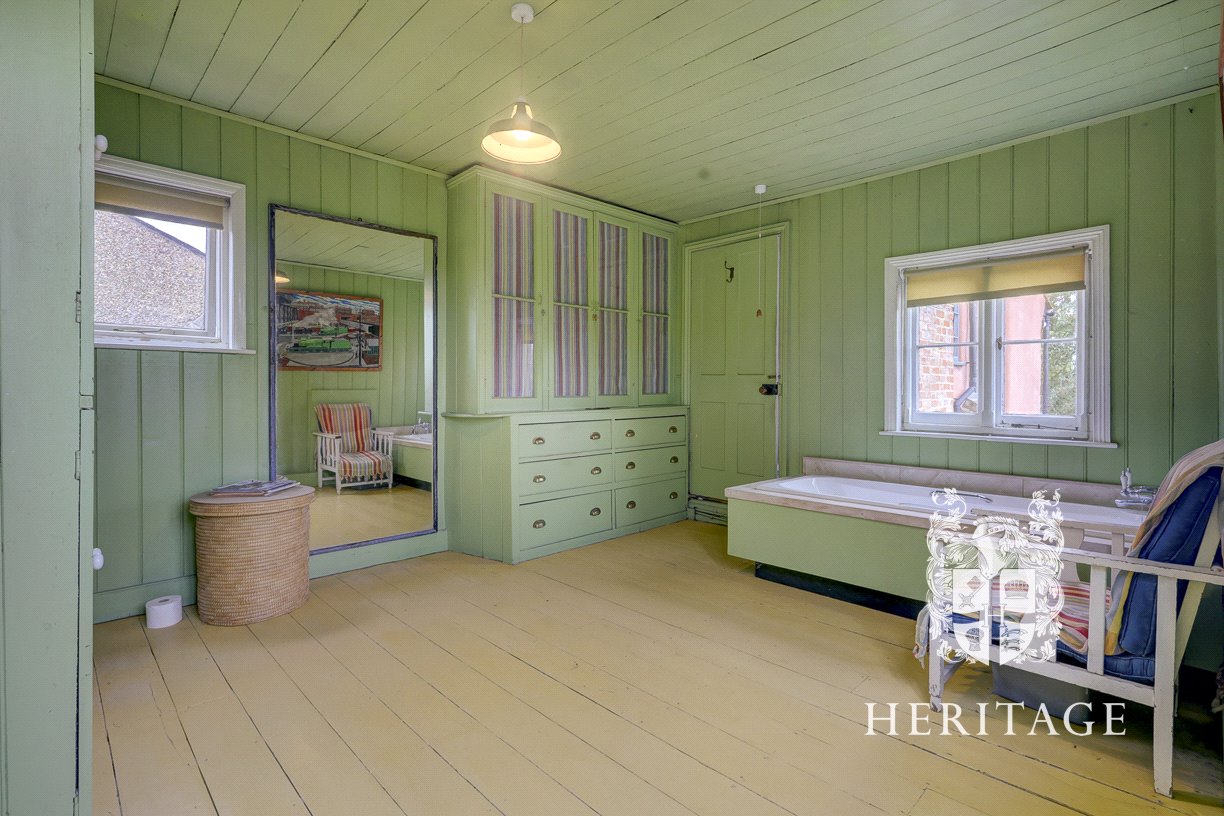 Upstairs, the first floor comprises four well-proportioned double bedrooms, complemented by a fifth room currently used as a study. At the centre of this level is a distinctive family bathroom, beautifully designed with bespoke cabinetry and an outlook that enhances its character. The bedrooms are arranged around a central landing, with the western wing extending some 27 feet. At its far end, a south-facing window draws in an abundance of natural light and frames a delightful view.