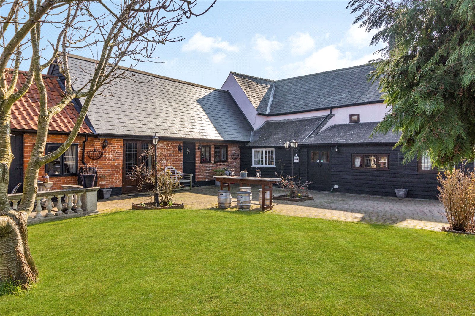The gardens are a true highlight, enjoying a sunny south-facing aspect and offering a private and tranquil setting—ideal for relaxation or outdoor entertaining. The gated courtyard provides secure parking for multiple vehicles, together with convenient access to the dining hall, workshop, and former studio, completing this exceptional home.