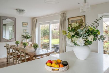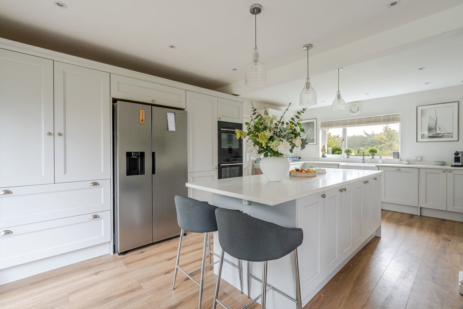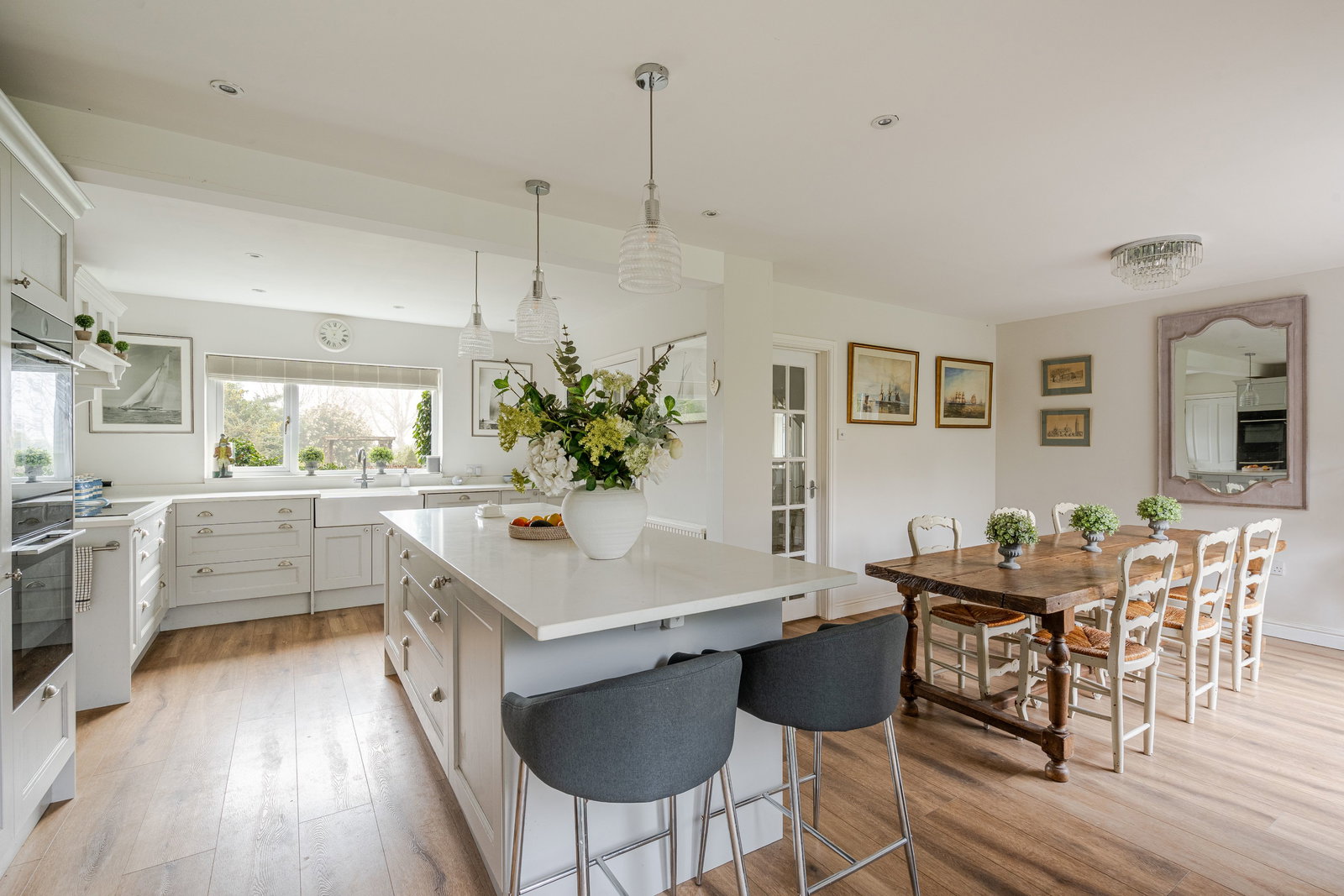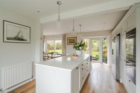 At the heart of the ground floor lies a newly reconfigured open-plan kitchen/dining room, forming a versatile hub ideal for daily family life or entertaining guests. The kitchen features an extensive range of units fitted around a central breakfast bar, and is well-equipped with an integrated dishwasher, double oven, induction hob, and built-in bin storage. A useful utility room has convenient rear access. Across the entrance hall, there is a a dual-aspect living room complete with an open fireplace.