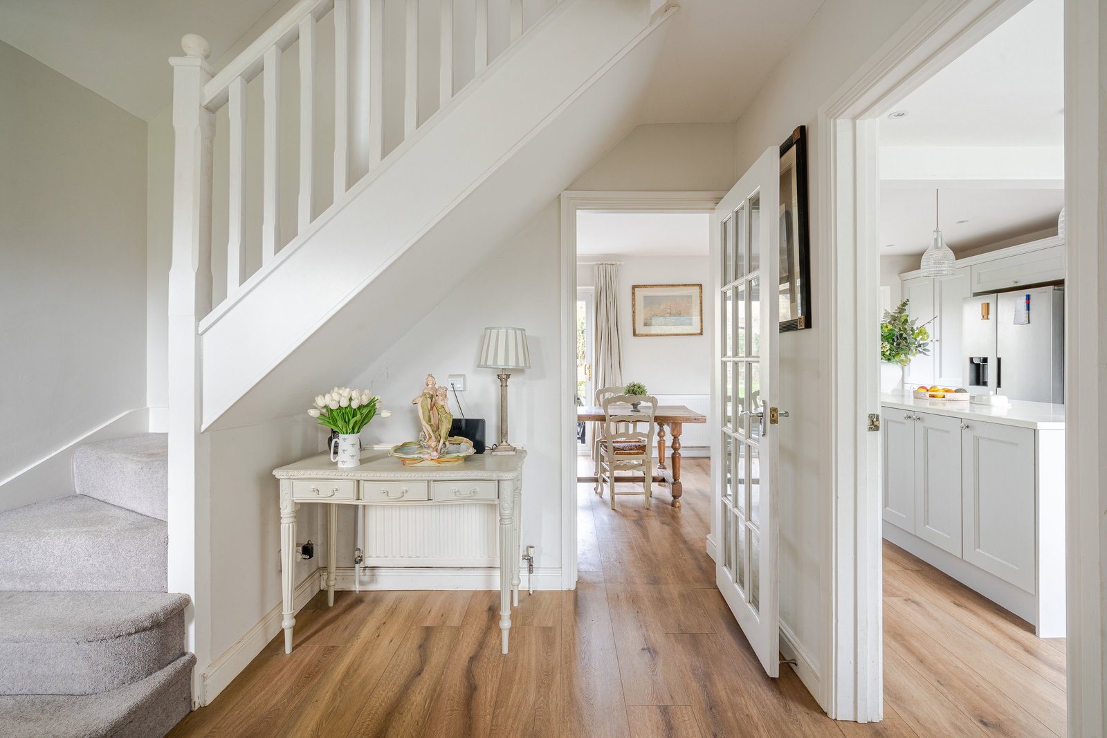 The first floor hosts four good-sized double bedrooms, each benefiting from fitted storage. The principal bedroom suite is dual-aspect, providing tranquil views across the surrounding countryside and boasting an updated en-suite shower room. The equally well-appointed family bathroom, also recently updated, is located off the landing.