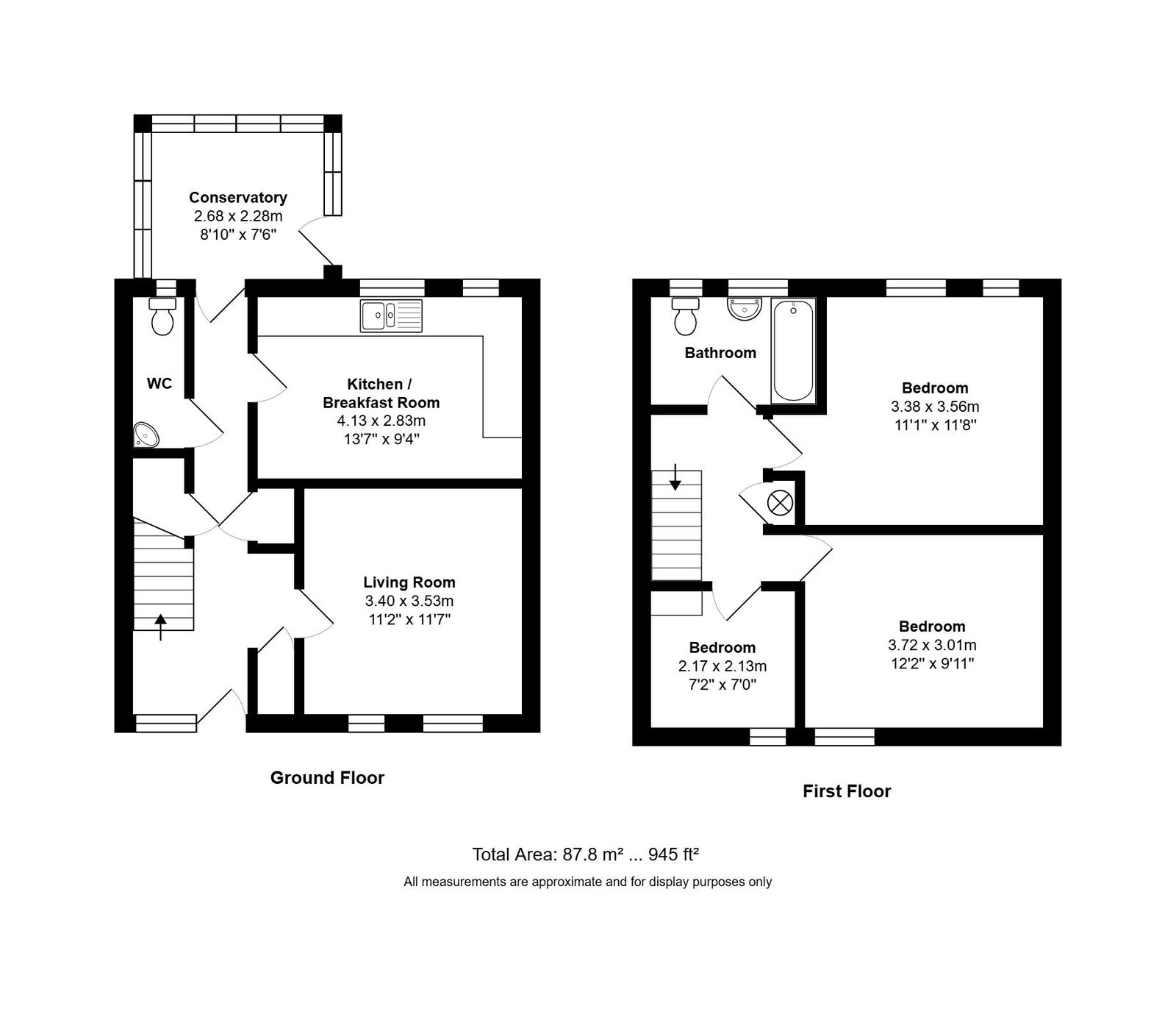 The light and bright accommodation extends to around 945 sq.ft. The ground floor has excellent built-in storage and comprises a front living room, fitted kitchen, rear heated conservatory, and WC. Upstairs, the accommodation has been reconfigured to provide two double bedrooms and a third single bedroom/office. The bathroom has a shower over the bath.