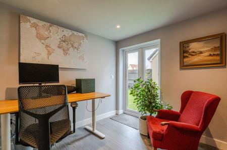 To the side of the house, there is driveway parking for two cars in front of the garage offering storage. At the rear of the garage there is a very useful converted home office with double doors connecting to the garden. Benefitting from a corner plot, the garden is very pleasant and laid for easy maintenance with artificial lawn, sun terraces, and raised timber beds. There is a concealed bin storage area to the side by the drive.
