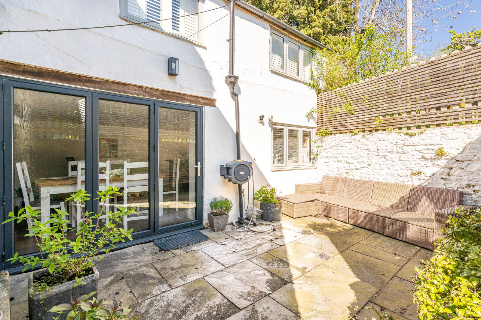 The southerly aspect garden has been designed for easy maintenance as a patio terrace, perfect for relaxing. An additional front garden area is planted with perennials. On-street parking is available along the road.