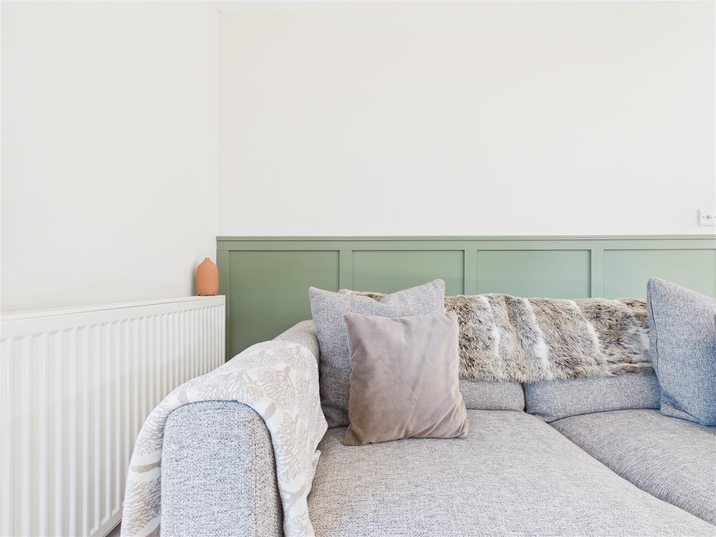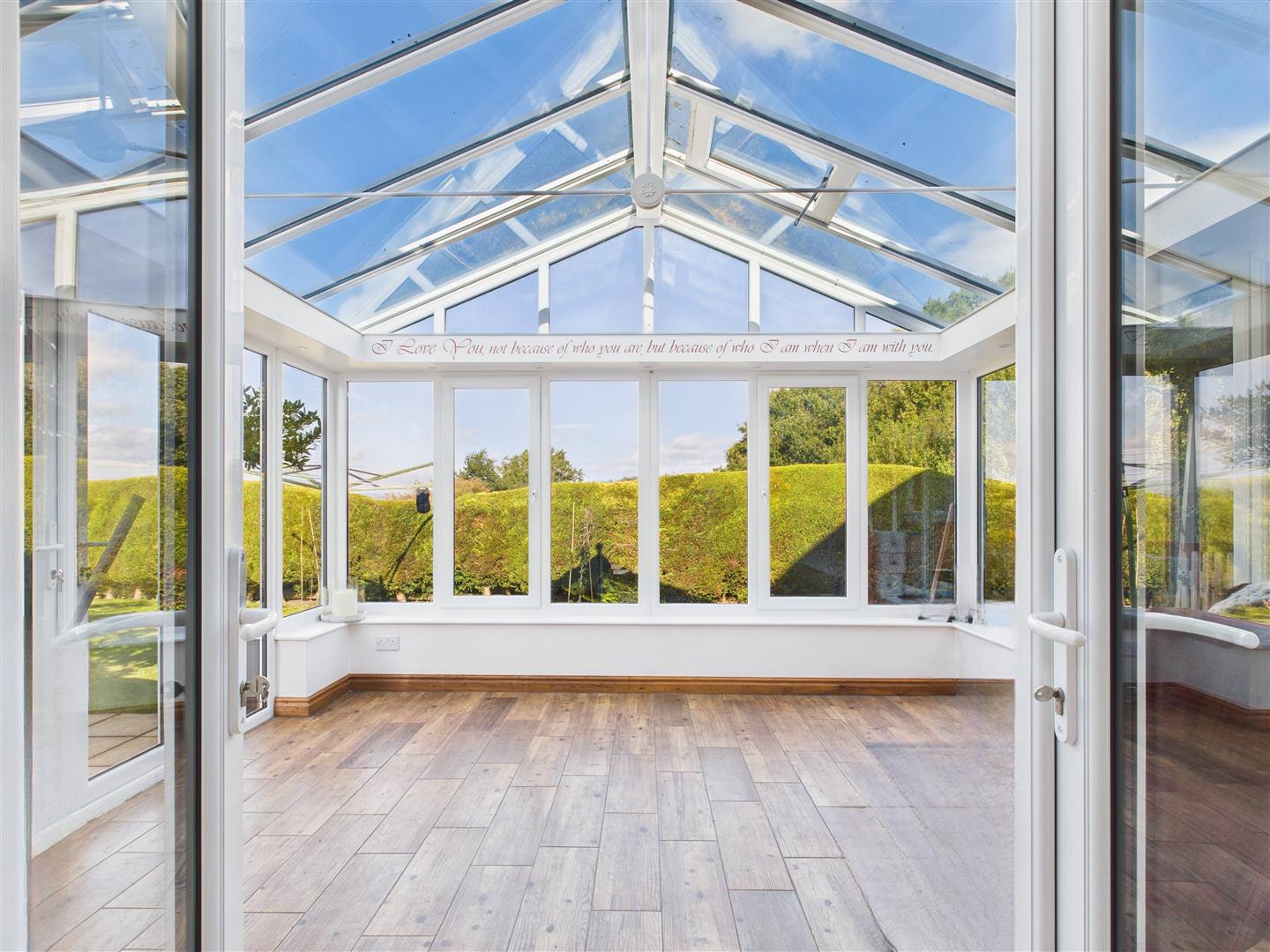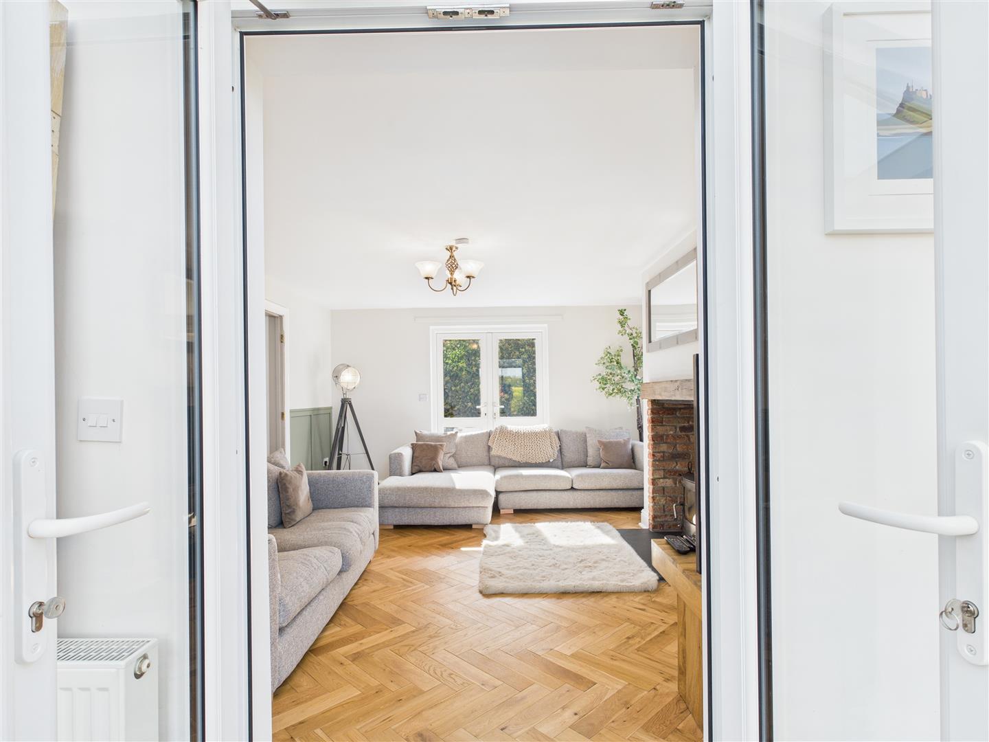 Flowing seamlessly from both the kitchen and dining room, the living room is a warm and characterful space. Featuring sage green panelling, a brick mantelpiece and a log-burning stove, it's the perfect spot to unwind. French doors open into the sunroom, a wonderfully bright and airy space (3.83m x 3.87m), with wraparound views of the mature gardens, ideal for reading, relaxing or simply enjoying the ever-changing skies over Ryedale.