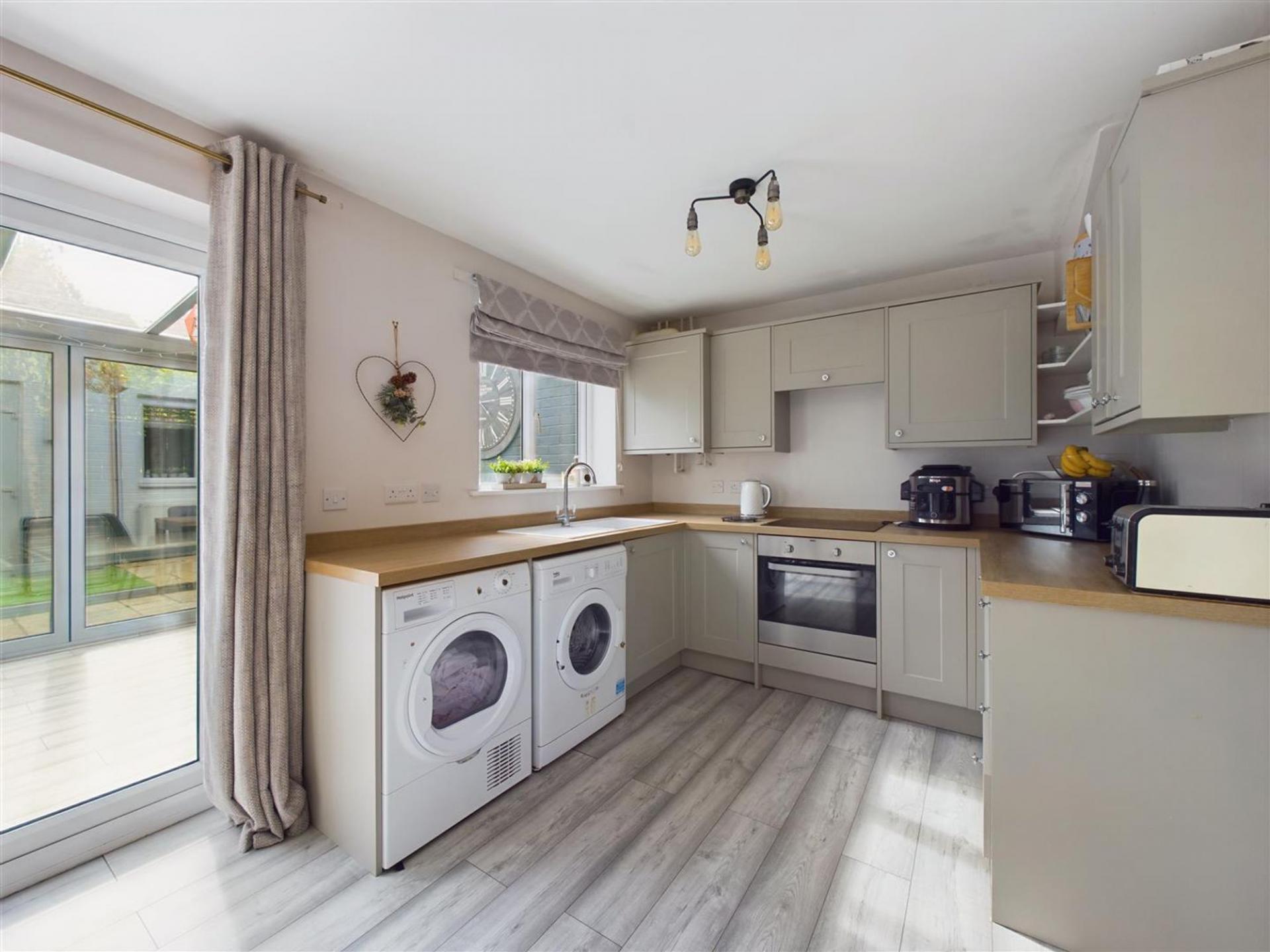 The accommodation is thoughtfully arranged and includes a welcoming living room and a contemporary kitchen designed for modern family life. A standout feature is the impressive garden room with bi-fold doors, creating a seamless connection between indoor living and the rear garden and providing an ideal space for entertaining or relaxing year-round.