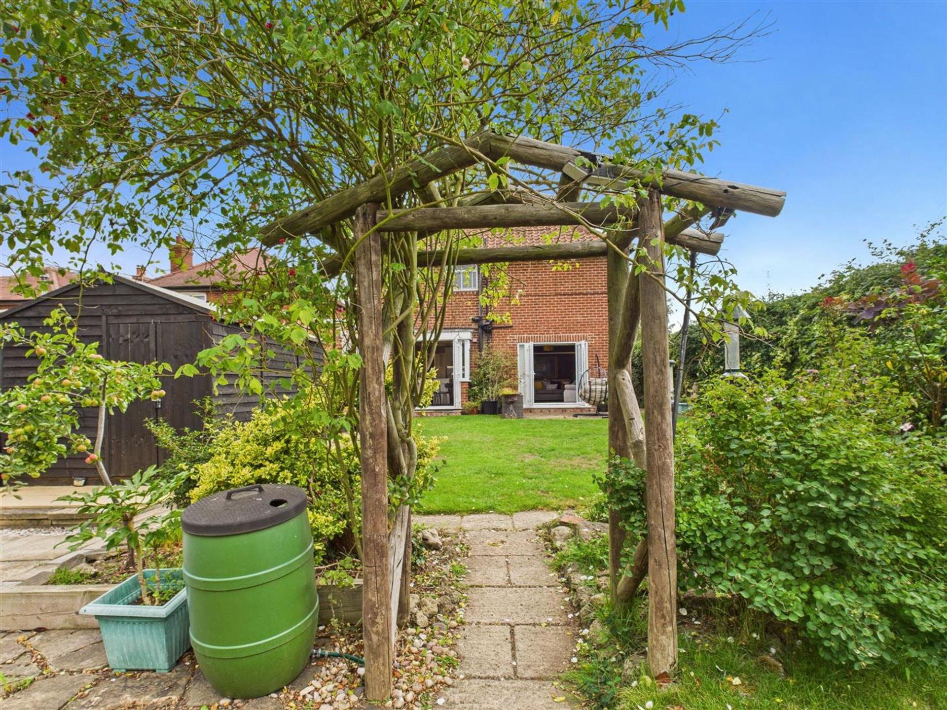 To the front, a private driveway provides off-street parking, while the secure, landscaped rear garden is a true highlight, offering a mix of lawn, patio, and established planting. There is also a garage to the side of the property.