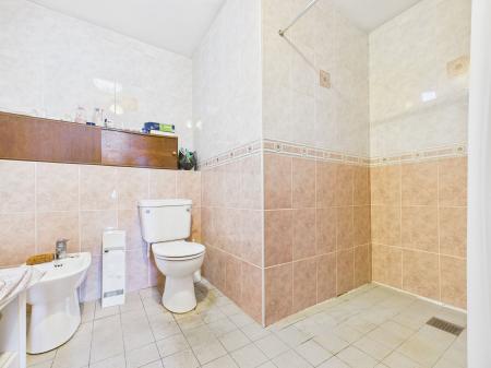 Both bathrooms are finished with fully tiled walls and feature a mix of practical and touches. Highlights include a walk-in shower with decorative tilework, a bath with a grab bar for accessibility, a bidet, and built-in storage for added convenience. The spacious layouts and ample natural light ensure a relaxing and functional environment, ideal for busy households.