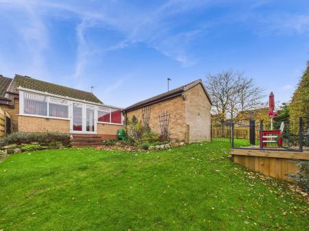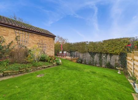 From the second bedroom, you step directly into the stunning conservatory, a standout feature stretching the full width of the property. Flooded with natural light, this beautiful space invites you to sit back and enjoy views of the garden all year round. French doors open out onto the generous outdoor area, where the garden wraps around the back of the garage, providing ample space for entertaining, play, or simply relaxing in the sunshine.