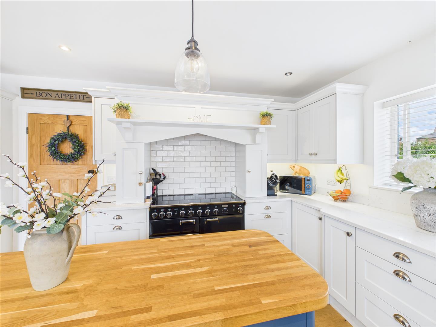 - Shaker kitchen with quartz tops, Belfast sink, and island