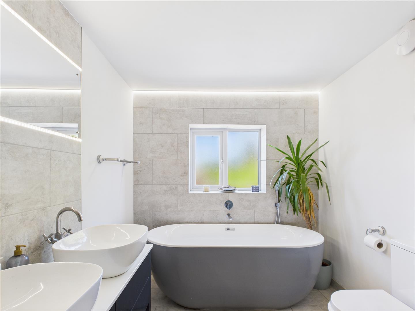 UPVC double glazed window to the rear aspect, modern white suite comprising of low flush WC, His and Hers wash hand basins, walk in double shower and free standing Oval bath with mixer taps, extractor fan, under floor heating.