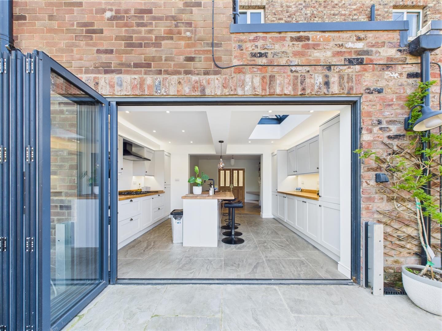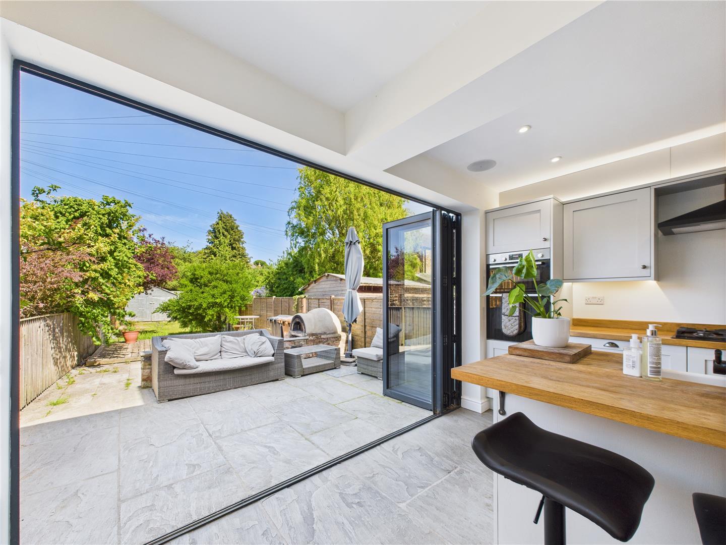 4.50m x 3.50m - (14'9" x 11'5" - ) - Bifold doors to the rear giving access to the rear garden, Roof Lantern. Range of Grey shaker style wall and base units with butcher block work surface, integrated fridge freezer, integrated washing machine, integrated condensing tumble dryer, electric double oven with five ring gas hob and extractor hood. Breakfast Bar/Island with Belfast sink with instant hot water tap, space for dishwasher, power points with USB point, underfloor heating.