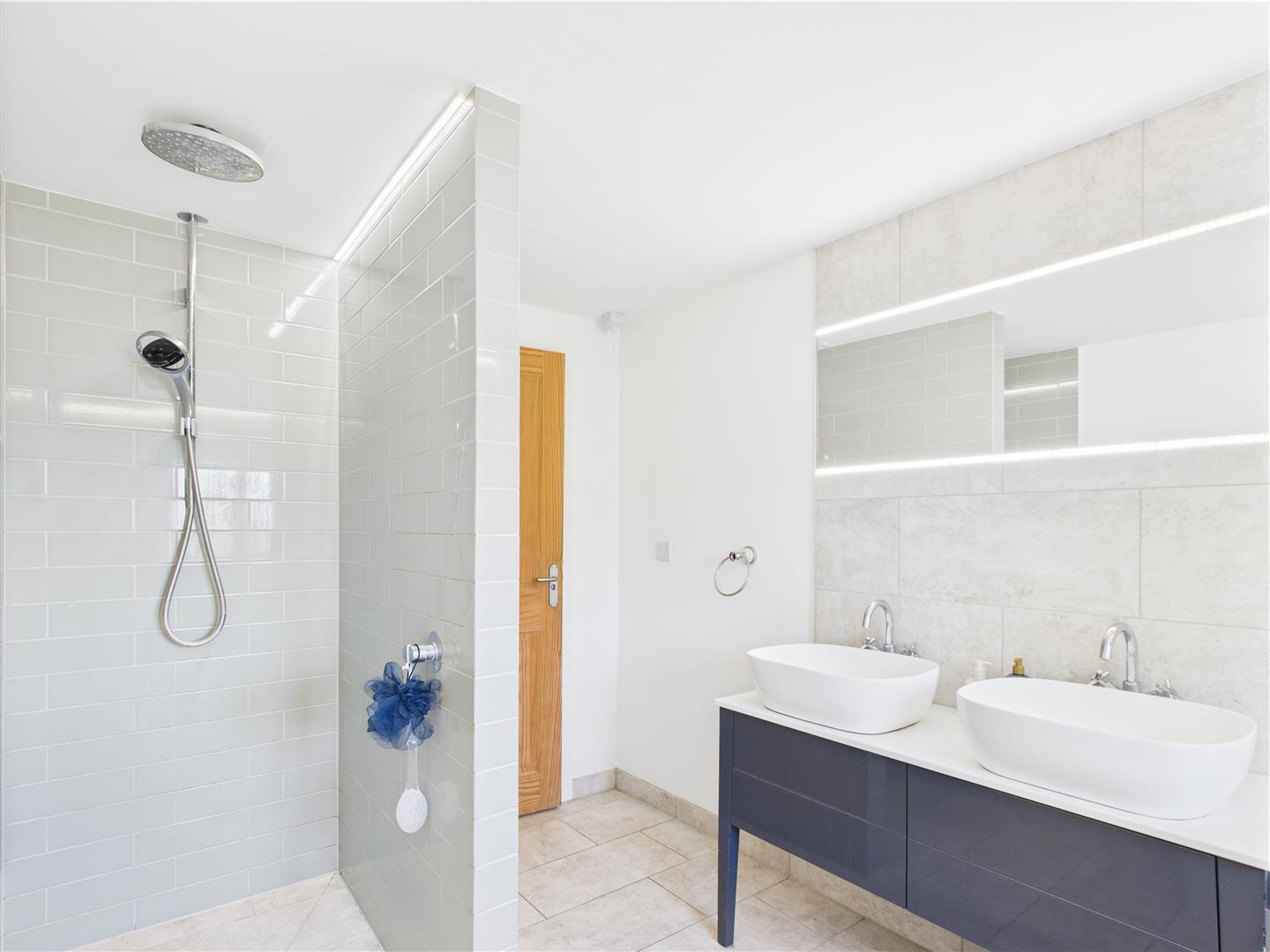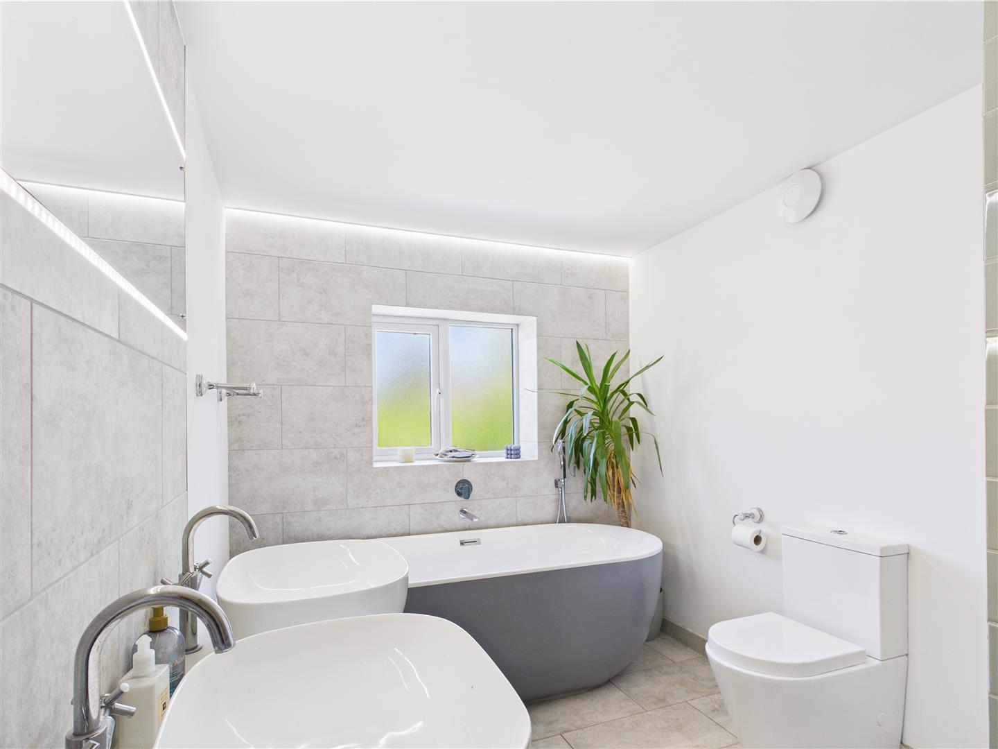 House Bathroom - UPVC double glazed window to the rear aspect, modern white suite comprising of low flush WC, His and Hers wash hand basins, walk in double shower and free standing Oval bath with mixer taps, extractor fan, under floor heating.