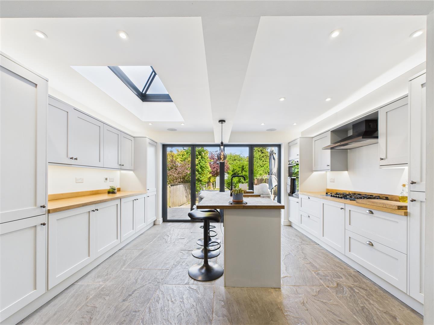 Kitchen/Breakfast Room - 4.50m x 3.50m - (14'9" x 11'5" - ) - Bifold doors to the rear giving access to the rear garden, Roof Lantern. Range of Grey shaker style wall and base units with butcher block work surface, integrated fridge freezer, integrated washing machine, integrated condensing tumble dryer, electric double oven with five ring gas hob and extractor hood. Breakfast Bar/Island with Belfast sink with instant hot water tap, space for dishwasher, power points with USB point, underfloor heating.