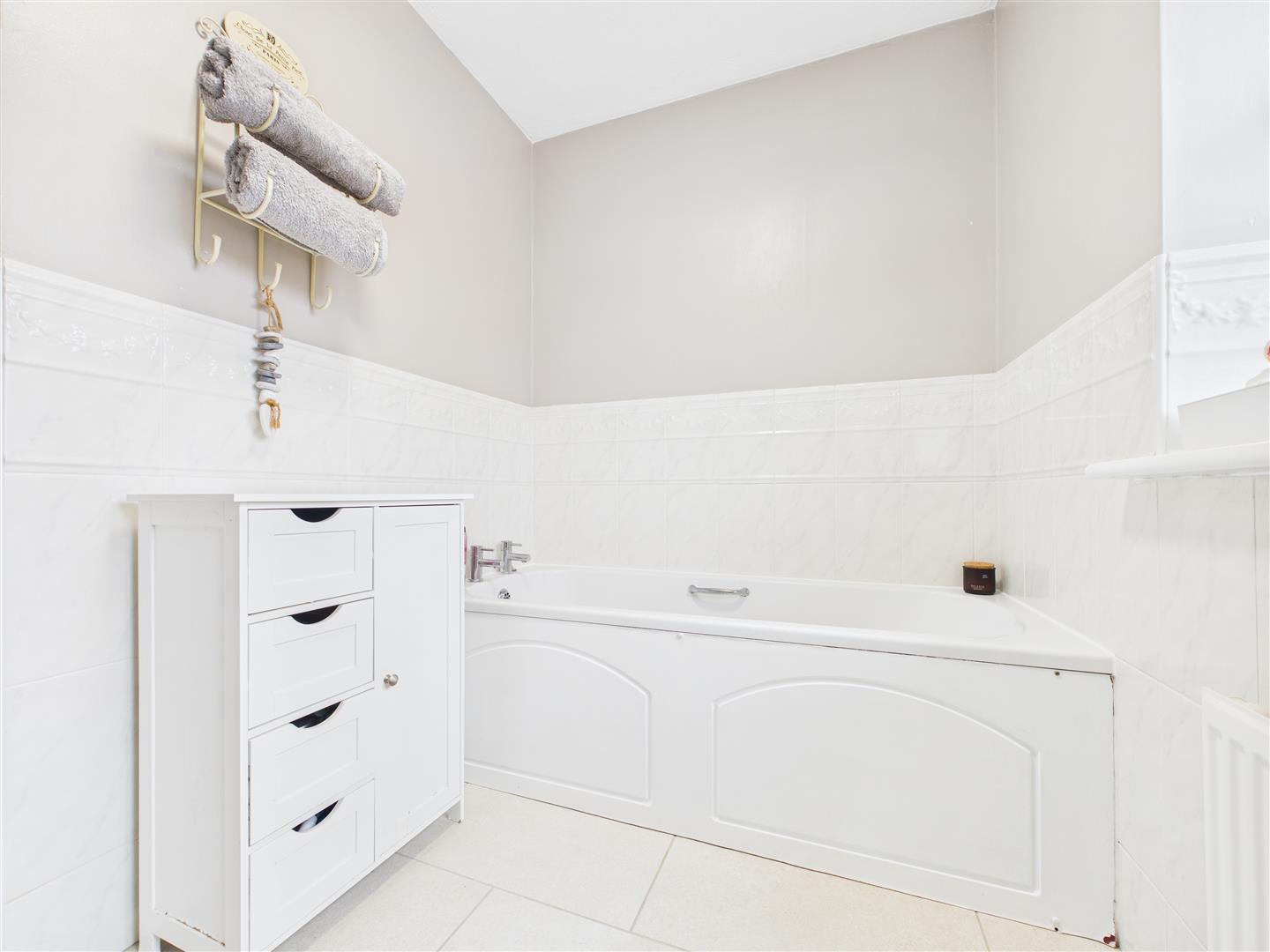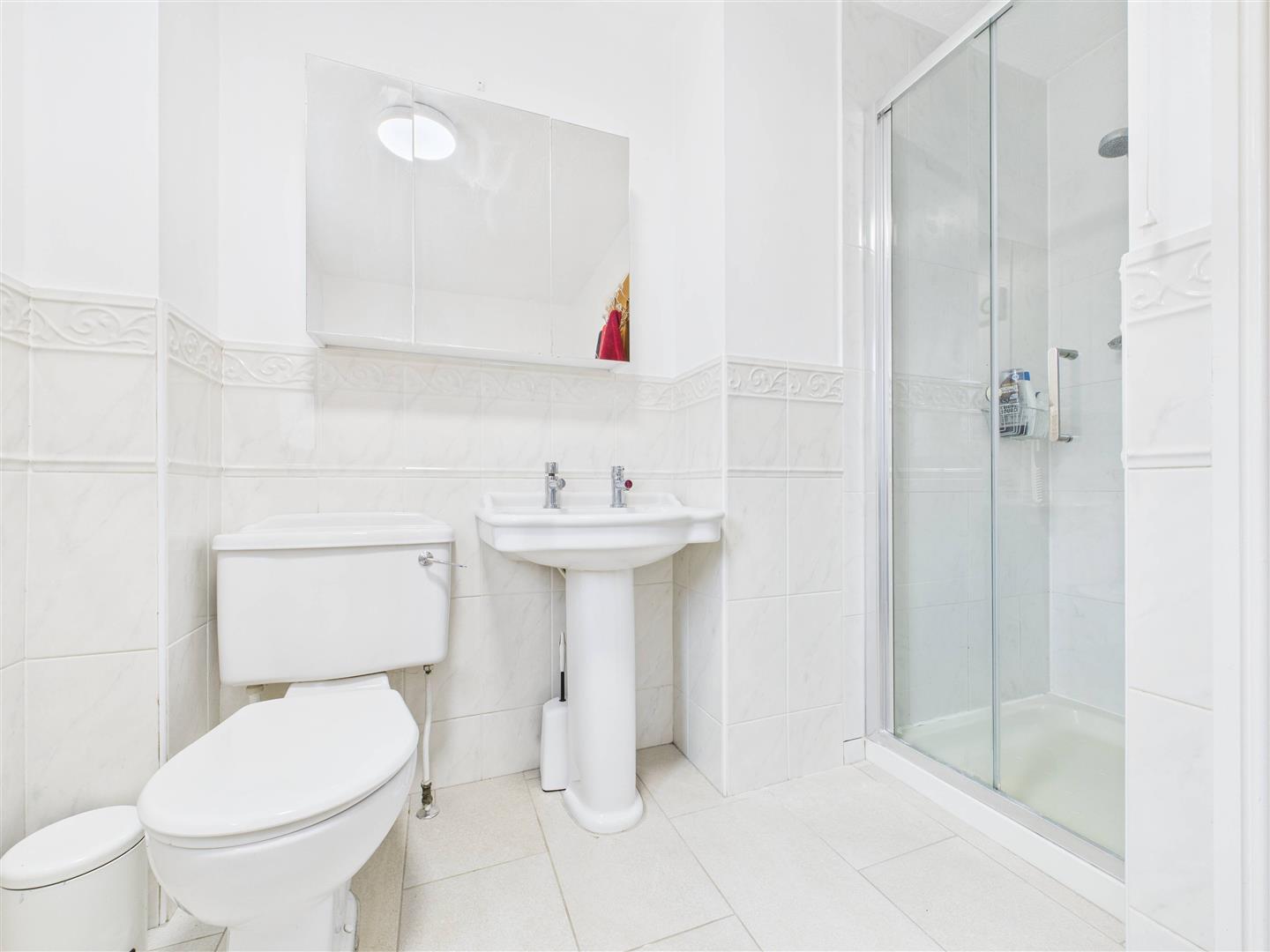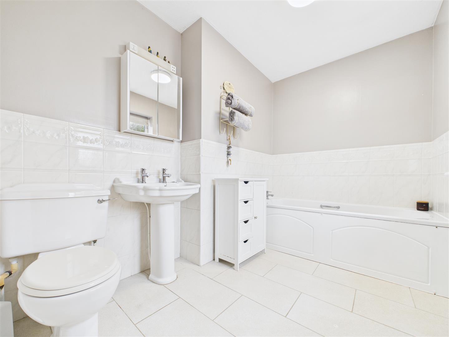Bathroom - 1.68m x 2.87m (5'6 x 9'5) - Window to side aspect, paneled bath, low flush WC, wash hand basin with pedestal, fully tiled shower cubicle, extractor fan, radiator, partly tiled walls.