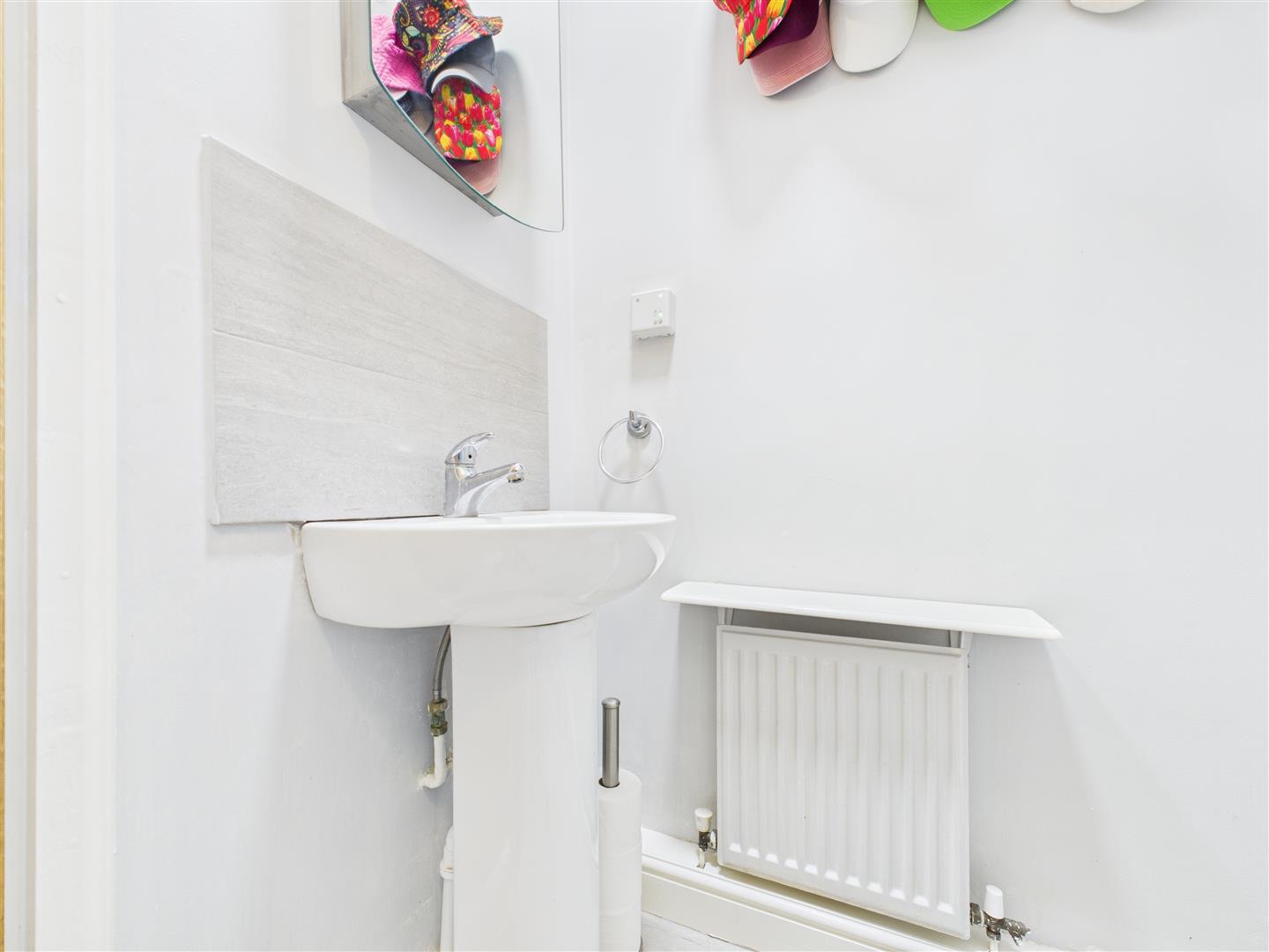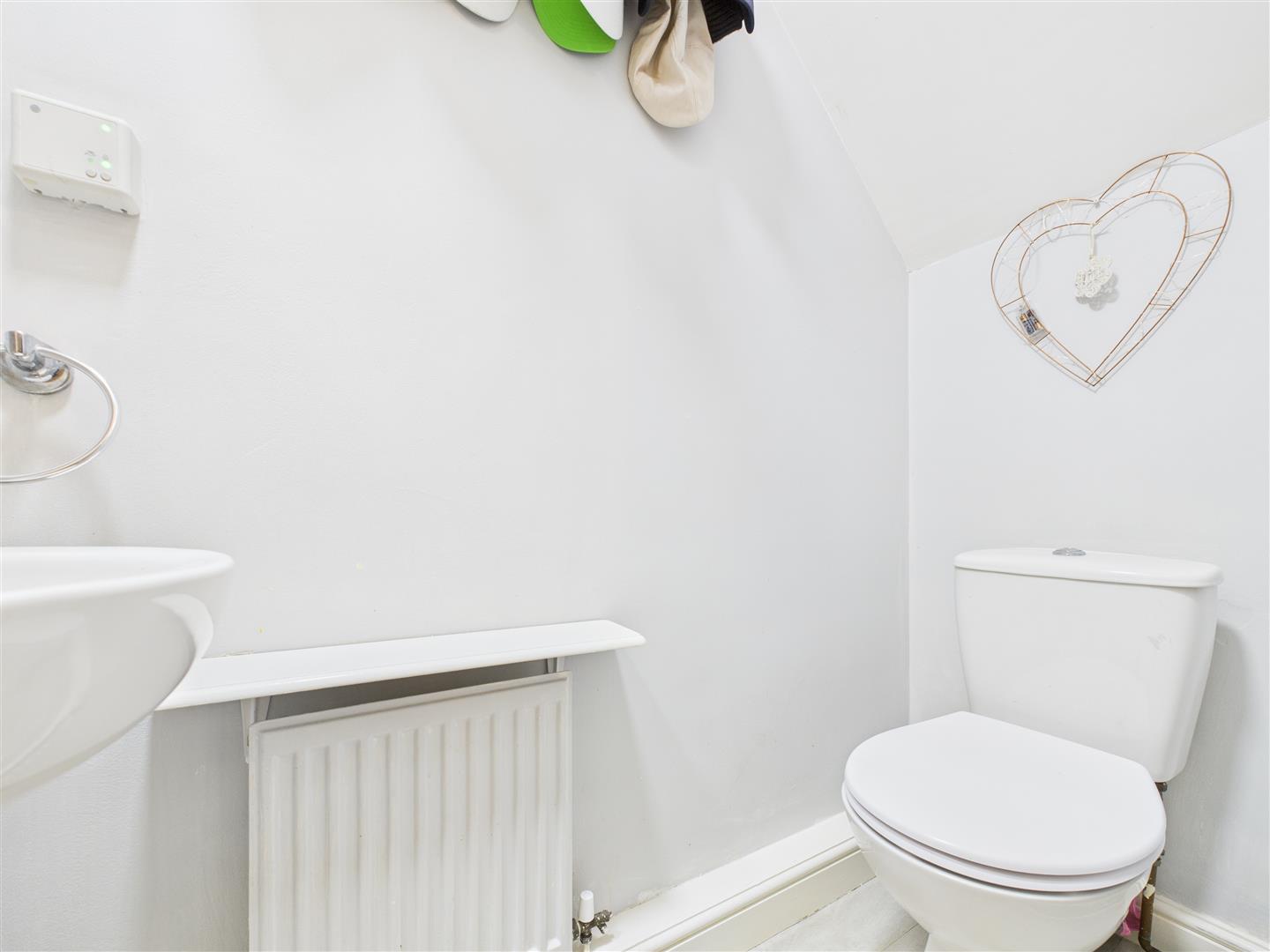 Guest Cloakroom - Low flush WC, wash hand basin with pedestal, radiator, wood effect flooring.