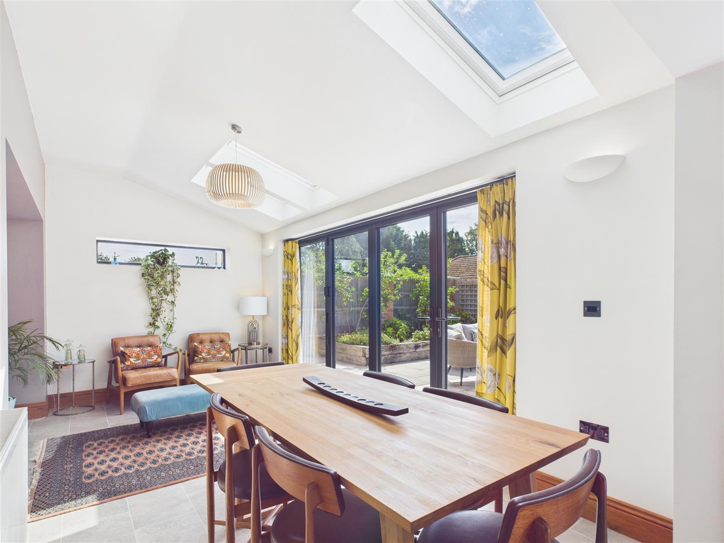 - Dual-aspect living room with brick fireplace and open plan dining area