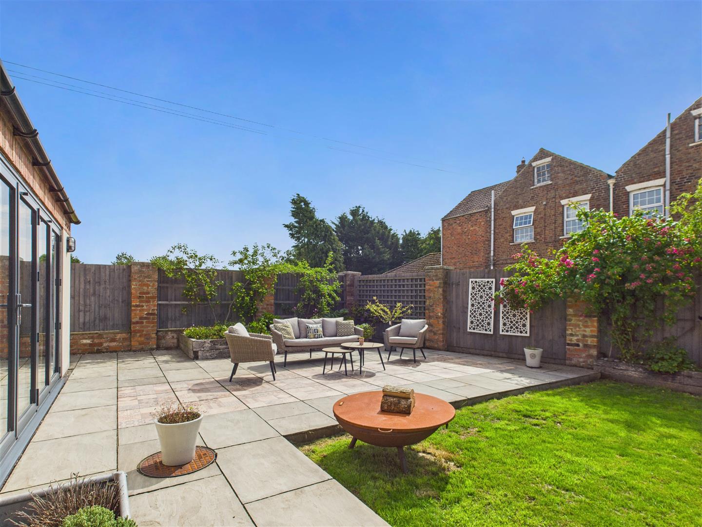 - South-facing garden with ceramic patio, lawn & raised beds