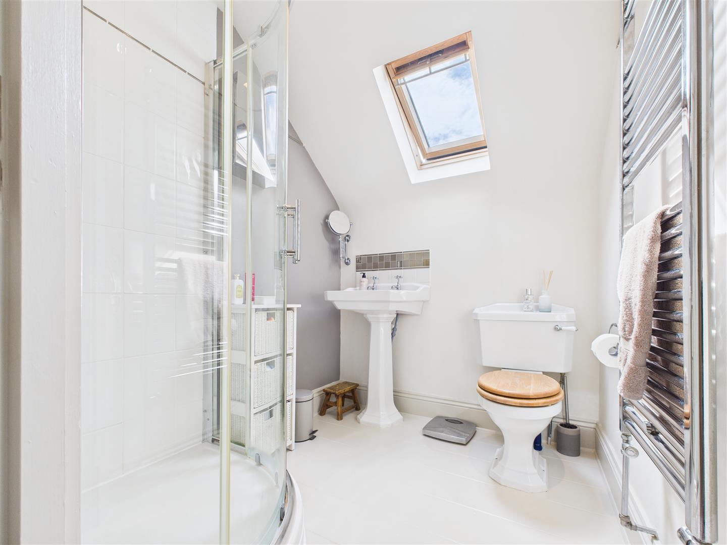 Upstairs, a galleried landing leads to five bedrooms, all, except the master with stripped wood floors. The principal bedroom enjoys dual aspect views, carpet, under-eaves storage, and a modern ensuite with Velux. Bedroom two also benefits from an ensuite and front aspect, while bedrooms two and four offer in-built wardrobes. A fifth bedroom/office and a stunning family bathroom with freestanding claw-foot bath and over-bath shower complete the first floor.