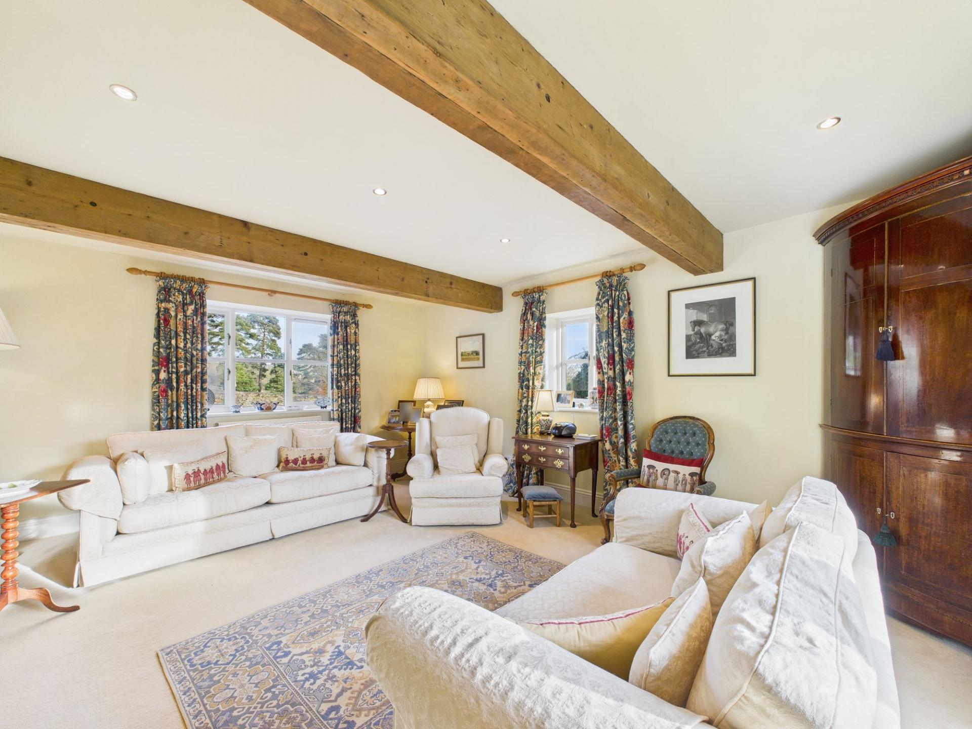 Step inside to discover a collection of warm and inviting interiors enhanced by exposed wooden beams, elegant hardwood flooring, and high-quality finishes throughout. The two reception rooms create atmospheric spaces with built-in shelving, period furnishings, and feature fireplace. The impressive open-plan kitchen and dining area serves as the heart of the home, showcasing a beautifully handcrafted kitchen equipped with a gas AGA, an additional gas hob, and premium integrated appliances. Bespoke cabinetry, a central island, and extensive wood flooring elevate the space, making it perfect for family gatherings or entertaining guests.