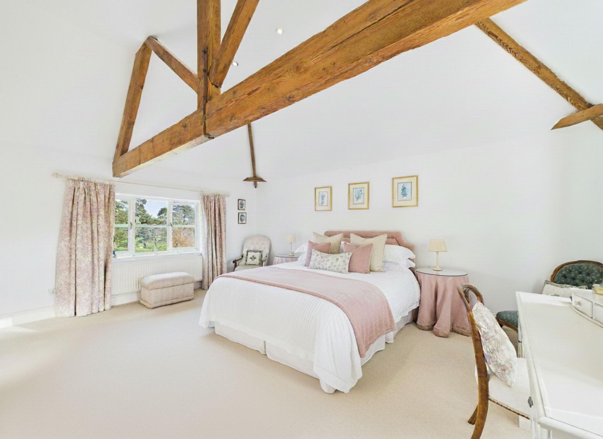 Upstairs, the spacious bedrooms are designed to promote comfort and tranquillity, featuring exposed beams, high ceilings, and abundant natural light from Velux and traditional windows. Each room offers excellent scope for personalisation, while built-in wardrobes deliver practical storage. The high-specification bathrooms include modern walk-in shower, glass enclosures, stylish vanity units, and beautifully tiled or wooden flooring. Skylights further enhance the bright, airy atmosphere, creating serene spaces ideal for rest and relaxation.