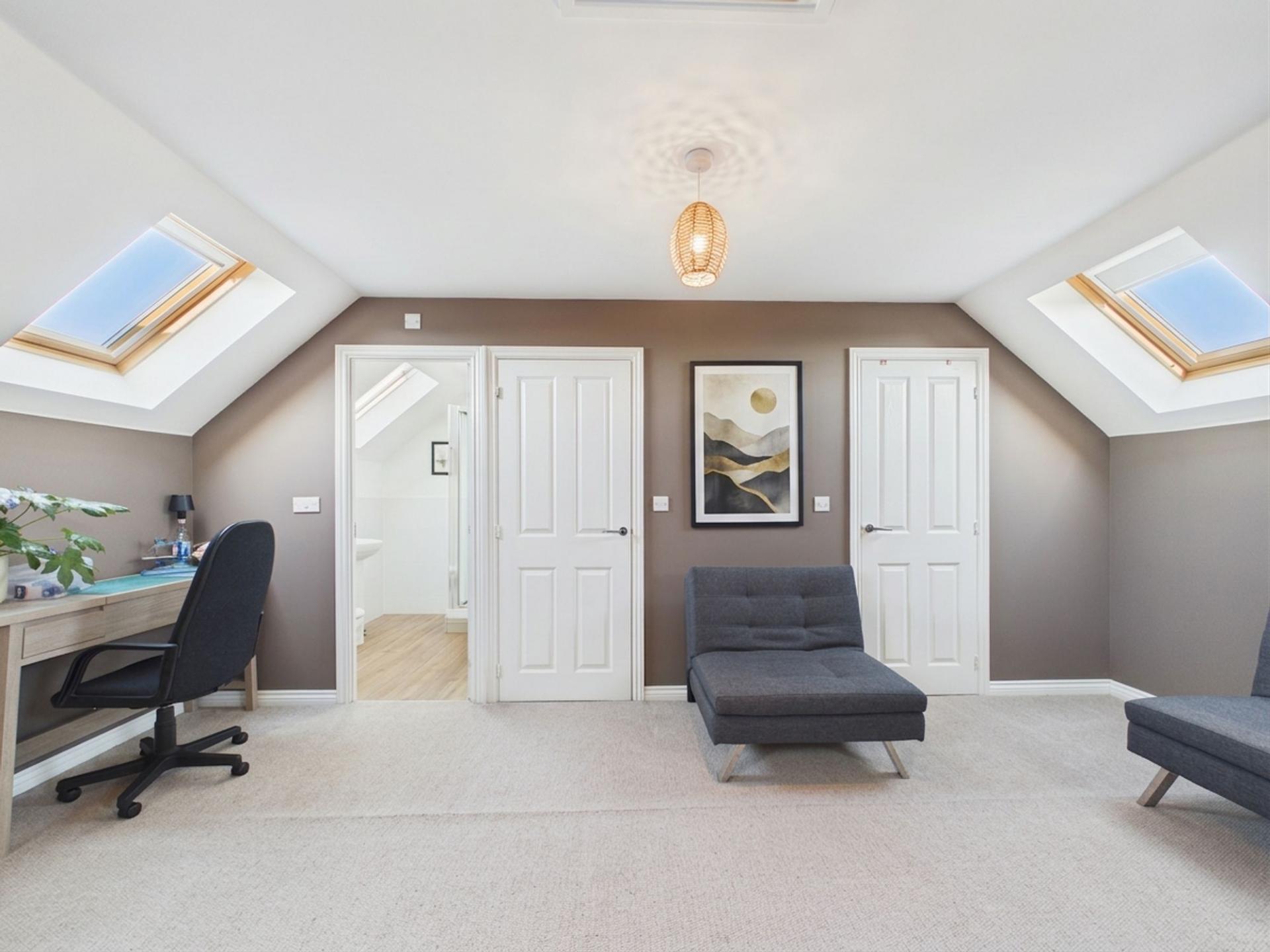 Occupying the entire second floor is the outstanding principal bedroom suite. This expansive space is enhanced by four roof windows, creating a light-filled and private retreat. It also benefits from an en suite shower room and an additional storage room.