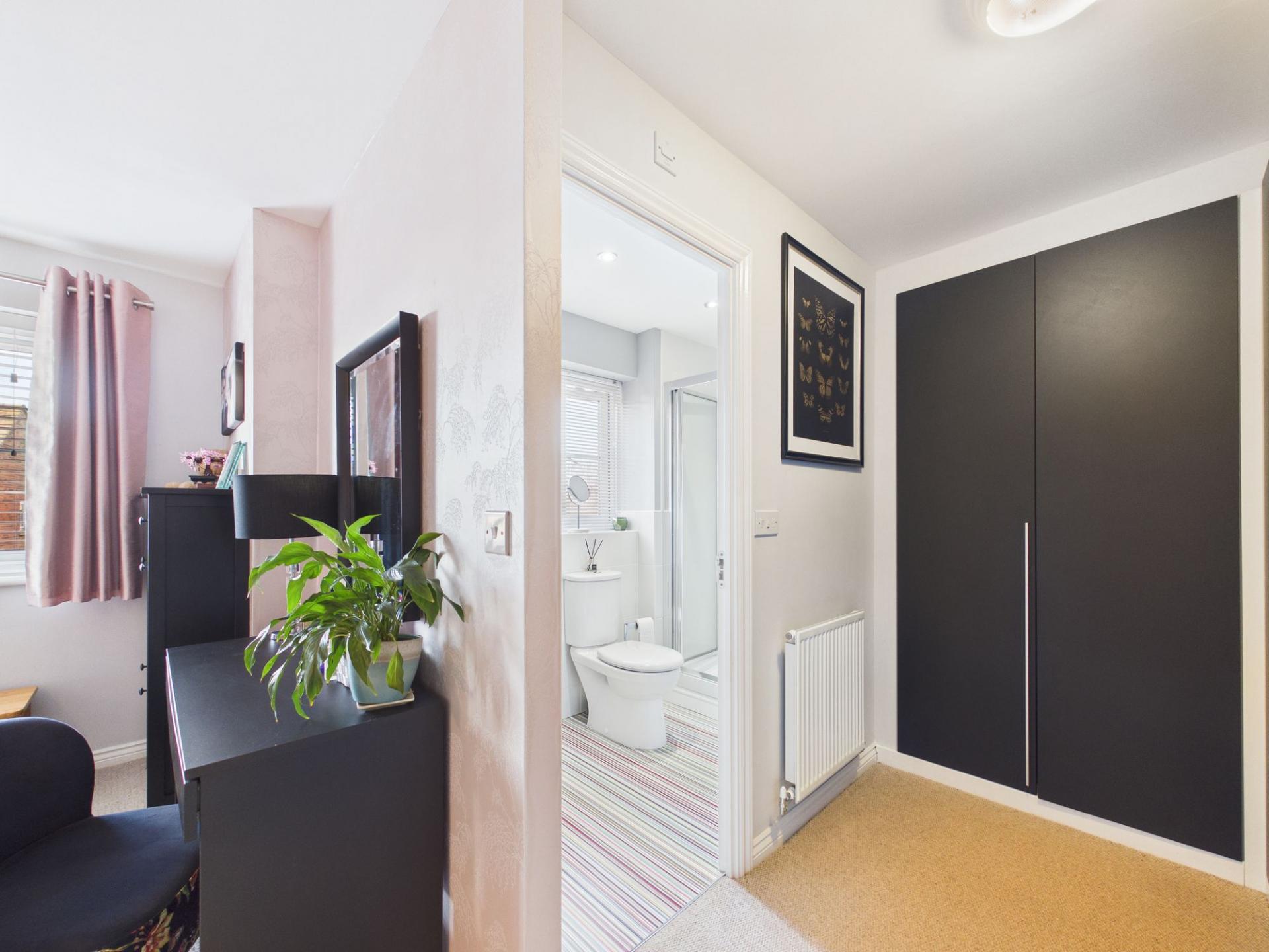 The first floor offers three generous double bedrooms and the family bathroom. Bedroom two is particularly impressive in size, featuring a double window to the front, an open-plan walk-in wardrobe area, and a contemporary en suite shower room. Bedrooms three and four are both comfortable doubles overlooking the rear garden. The family bathroom is beautifully finished, offering both a separate bath and shower, complemented by stylish green accents and white tiling.