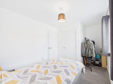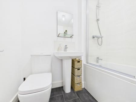 Upstairs, two well-proportioned bedrooms sit either side of the landing, alongside a central bathroom. Finished with modern charcoal tiling, the bathroom offers a bath with overhead shower, WC, and wash hand basin, completing this smart and functional home.