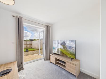 To the rear, the lounge provides a cosy retreat, with French doors opening directly onto the garden – a private outdoor space with a lawned area, patio, and gated access to the side.