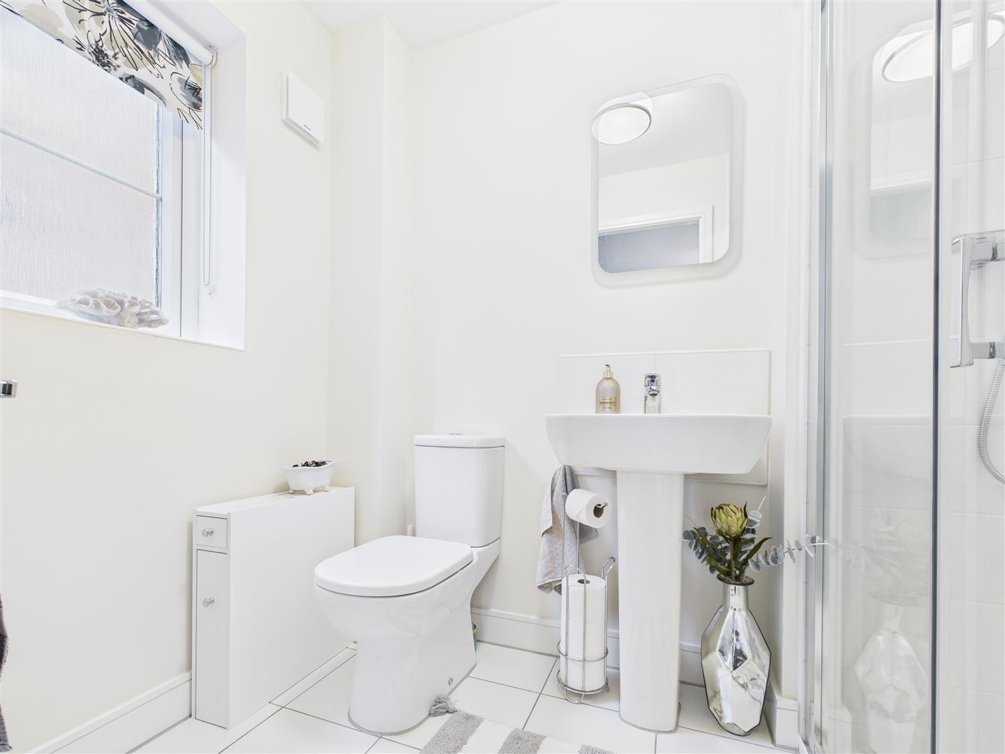 En-Suite - 1.36 x 2.3 (4'5" x 7'6") - Low flush WC, hand wash basin with pedestal, fully tiled walk in shower, radiator, extractor fan.