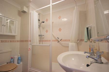 Fitted with a low level WC, vanity wash basin with cupboard under. Walk in shower enclosure with thermostatically controlled shower over. Walls finished in complementary tiling. Coving to ceiling. Ceiling light point. Emergency alarm pull cord. Wall mounted electric heater, towel rail and extractor.