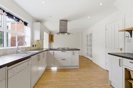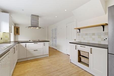 A modern kitchen with a range of wall and base units with a granite effect laminate worktop and feature breakfast peninsula with inset four ring gas hob and over head extractor fan. Inset stainless steel sink and half sink with draining unit with a tiled backsplash in front of a window overlooking the garden. Integrated 'Bosch' electric oven and grill. Six spot down lights. Space for fridge freezer and washing machine. Door into Utility room. Wood effect laminate flooring connecting into...