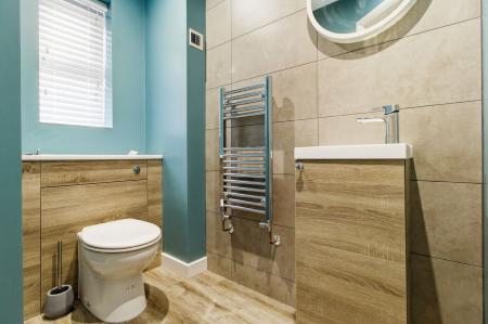 A modern and recently installed downstairs toilet with two spot down lights. Obscure glazed window to the front aspect. Low level toilet. Sink with chrome mixer tap and undercounter storage. Tiled walls. Wooden effect laminate flooring.