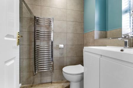A recently installed suite with walk in shower cubicle with over head mains powered rainfall shower head with a tiled surround. Sink with under counter storage and a tiled surround. Low level toilet. Obscure glazed window to the side aspect with fitted blinds. Three spot down lights. Extractor fan. Wood effect laminate flooring.
