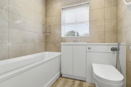 Recently modernized with obscure glazed window to the rear aspect. A panelled bath with over head mains powered rainfall shower. Tiled walls. Sink with chrome mixer tap and undercounter storage. Low level toilet. Four spot down lights. Wood effect laminate flooring. Extractor fan.